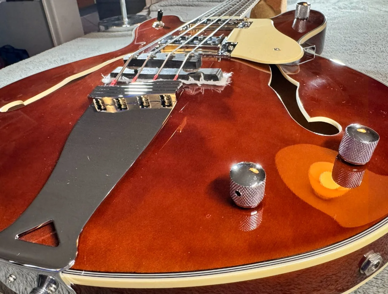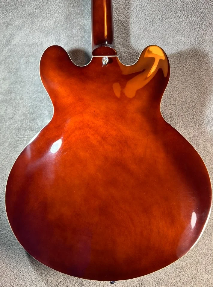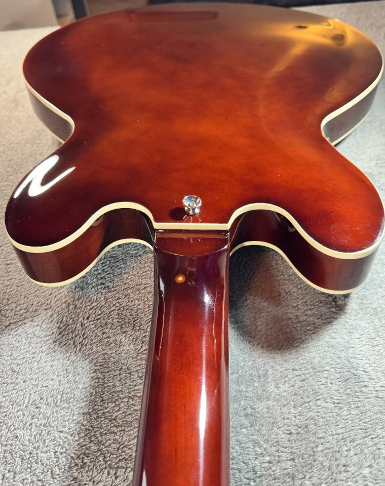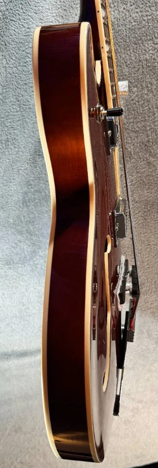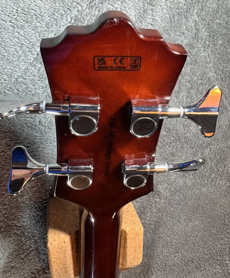 Der Bass hat einen walnussbraunen Hollowbody aus Ahorn mit einer gewölbten Decke. Der eingeleimte Hals mit einem „C“ – Halsprofil hat, genau wie der Body ein cremfarbenes Binding und ist ein Shortscale Hals mit 30“ Länge. Der Hals ist ebenfalls aus Ahorn, das Griffbrett ist aus Laurel.