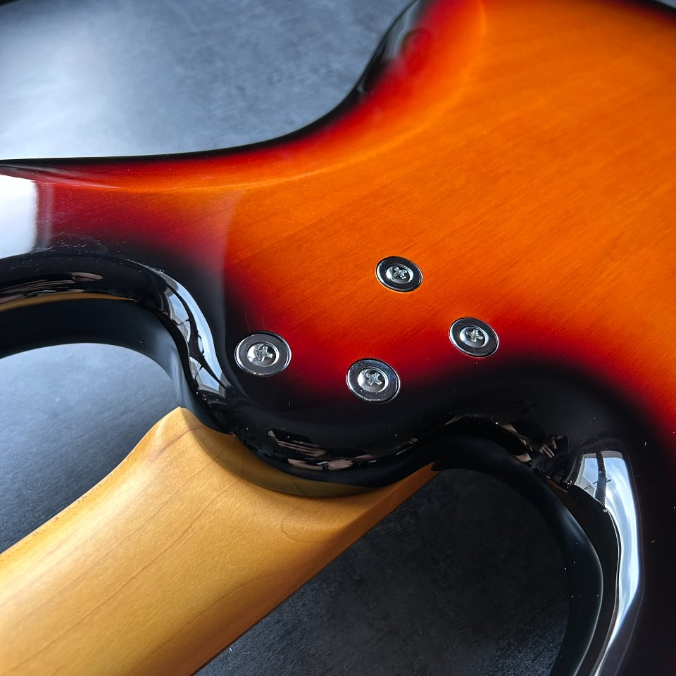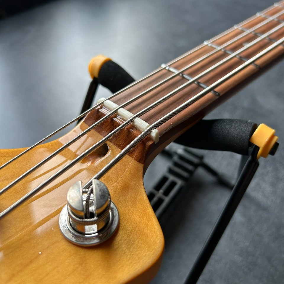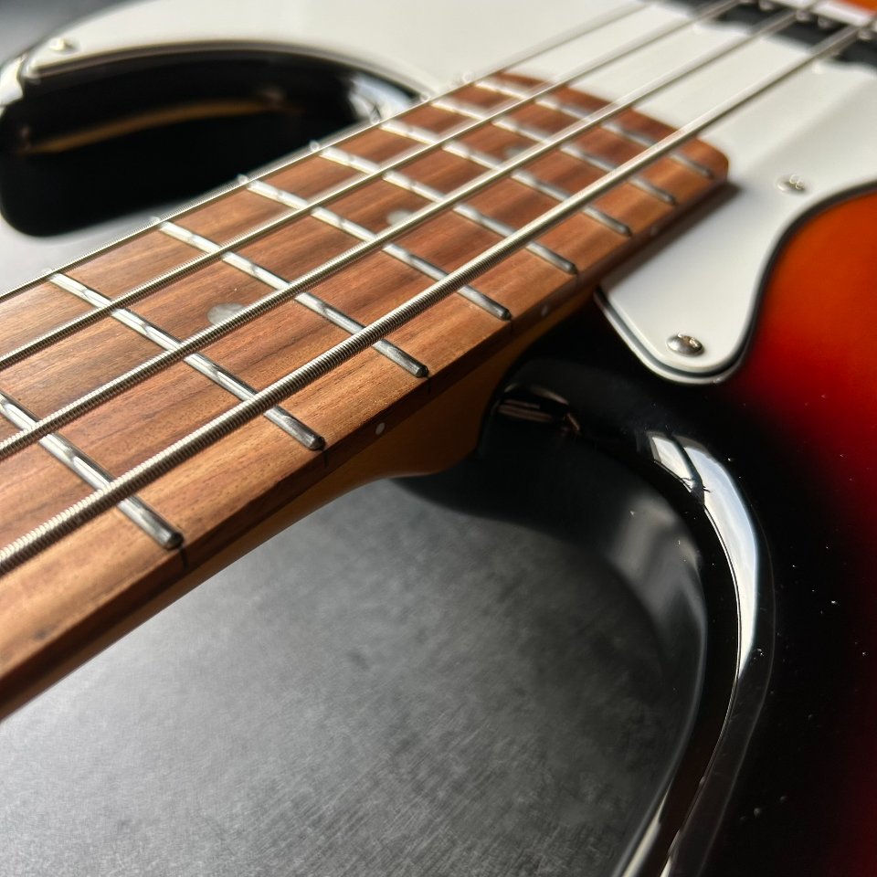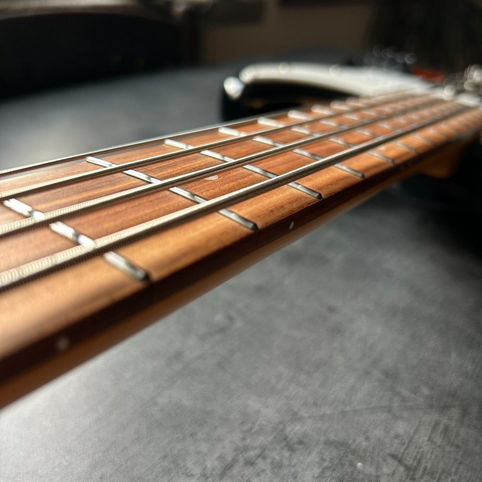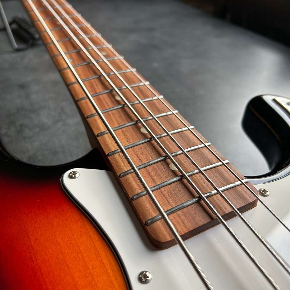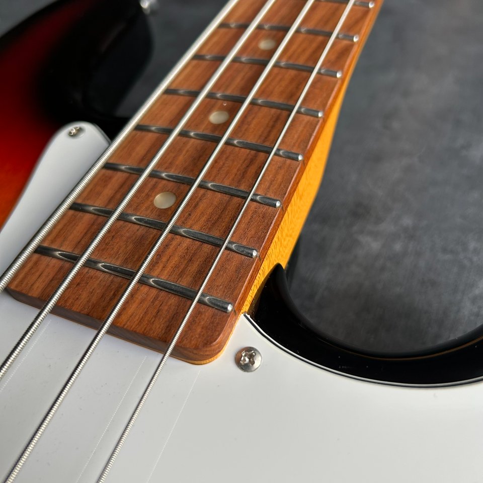 The bass certainly doesn't look low-budget – the wood (alder body, pao ferro fretboard), the hardware (thicker steel bridge, decent tuners), and details like the bone nut and three-ply pickguard are all well-received. The finish is also beyond reproach: the rounded frets, neck pocket and pickup holes are perfectly cut, and the paint job is flawless. Truly solid workmanship.