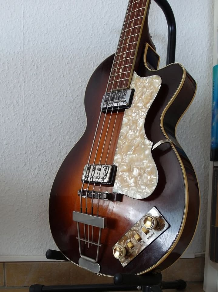 Höfner Club Bass 500/2 aus 1965. Eines der ersten in 1965 angebotenen Modelle, noch mit den schmalen Pickup-Rahmen aus dem Produktionsjahr 1964, die in der zweiten Jahreshälfte durch die breiteren Rahmen ersetzt wurden. Die Potis stammen aus der 8. bzw 10. Produktionswoche 1965, also Februar/März, so daß der Bass selbst vemutlich im Frühjahr 1965 in den Verkauf kam.