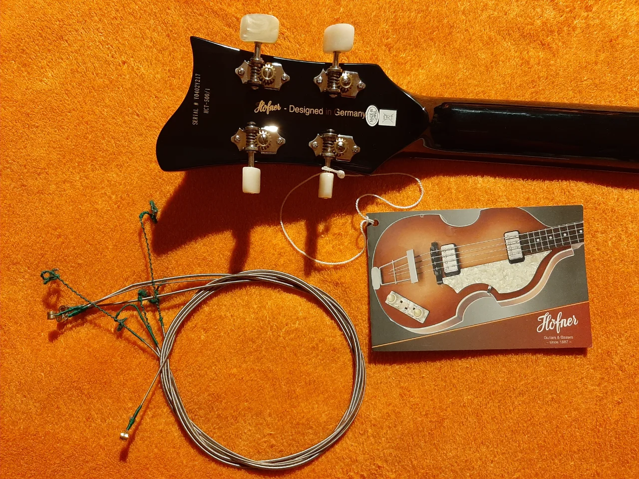 Ich habe gleich nach dem Kauf die am besten geeigneten flatwound Saiten (Daddario Chromes ECB81M) aufgezogen und die originalen roundwounds gebe ich mit dazu. Der Hangtag ist auch noch dabei.