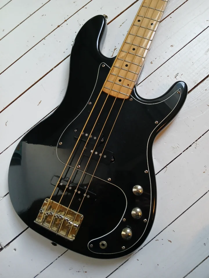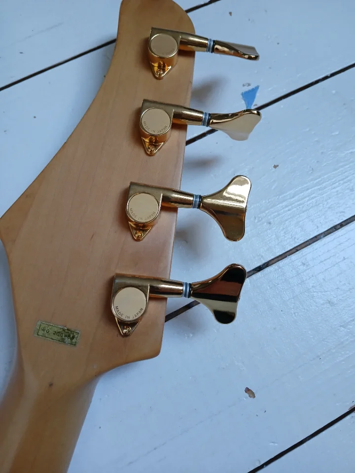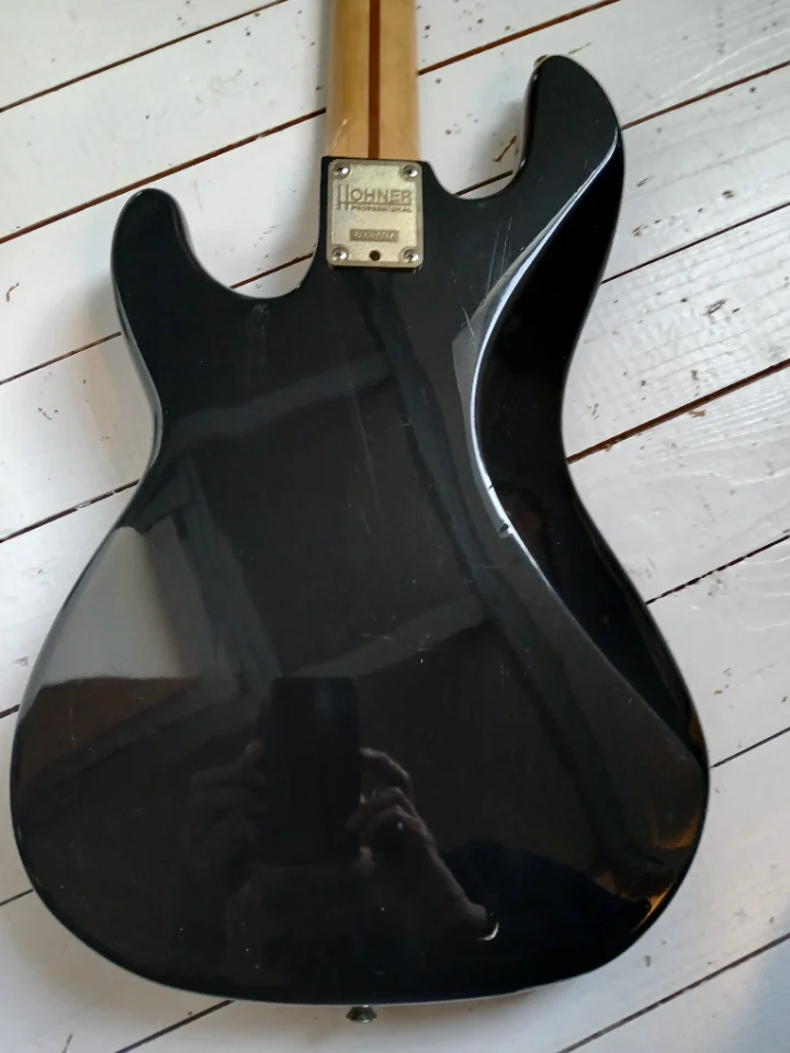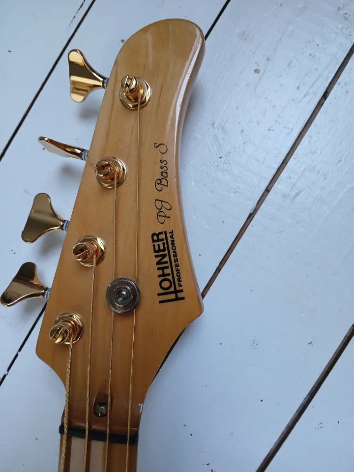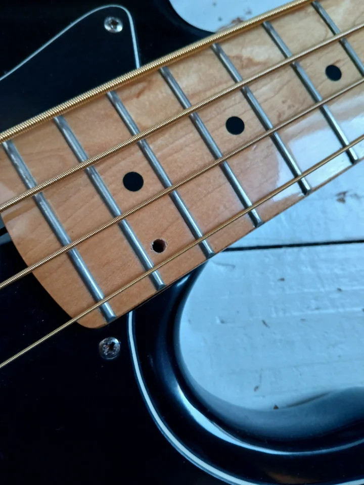 Irgendjemand hatte ihn komplett zerlegt. Ich hab ihn reanimiert, die klapprigen Tuner durch hochwertige Ibanez NOS ersetzt und die PUs durch Alnico. Einziges Manko: der Vorgänger hat warum auch immer, ein Loch ins FB des wunderschönen OPMN mit Tiltfunktion gebohrt (s. Foto). Der Hohner Special PJ besitzt einen Ahorn Korpus!!