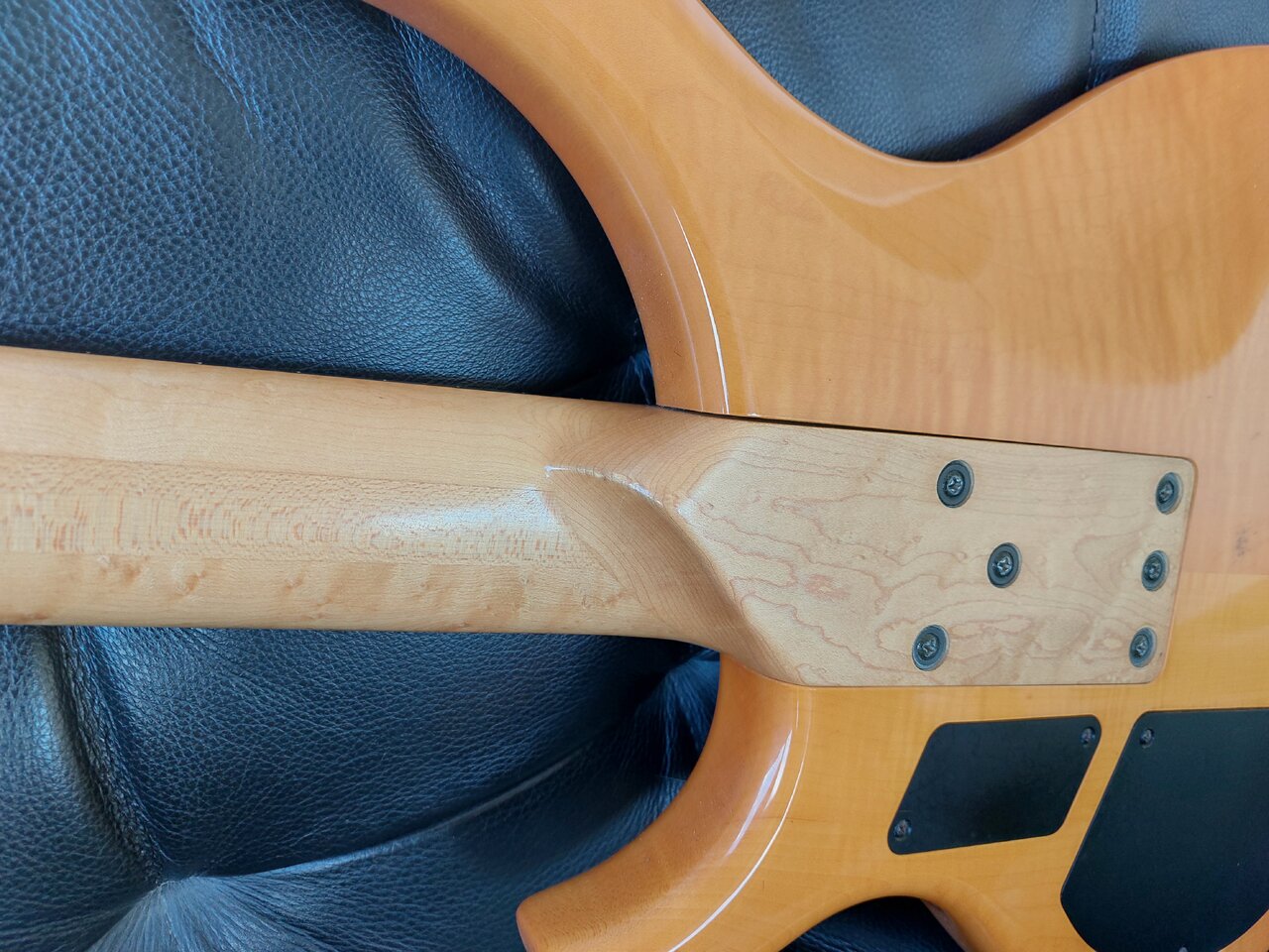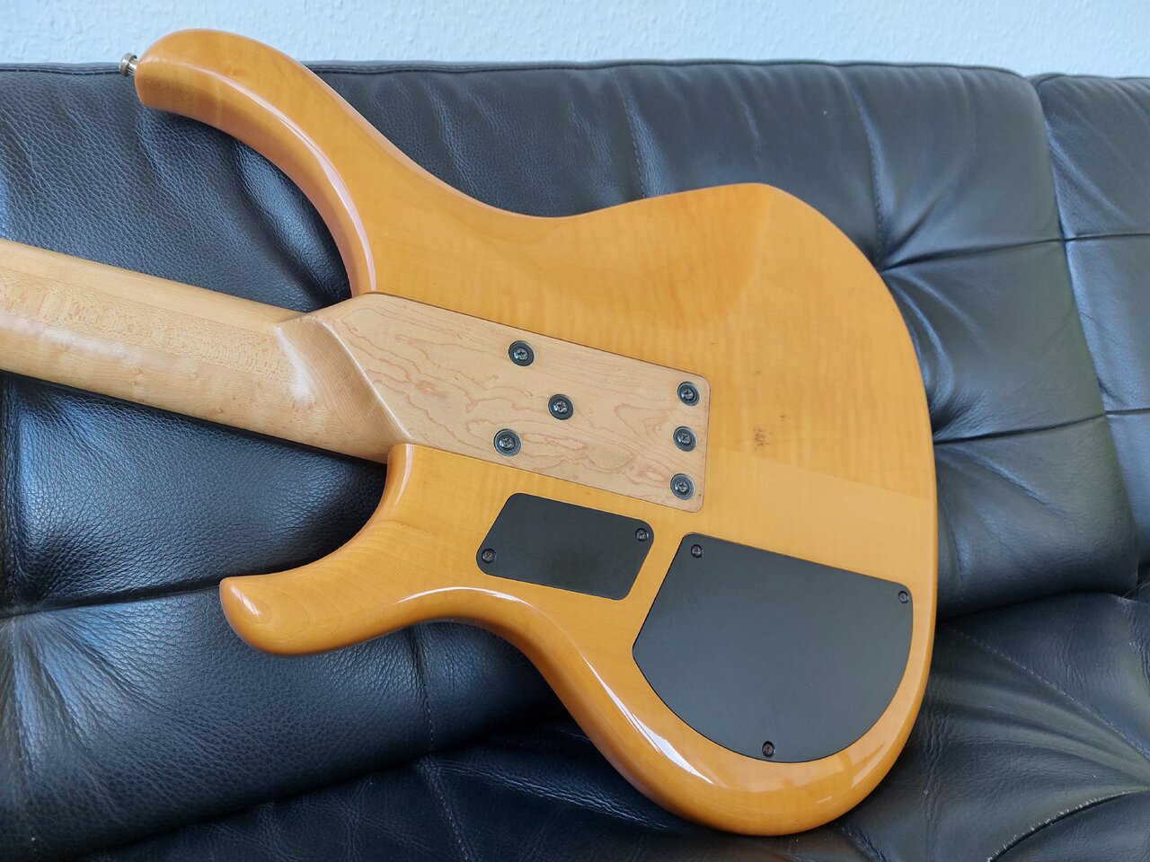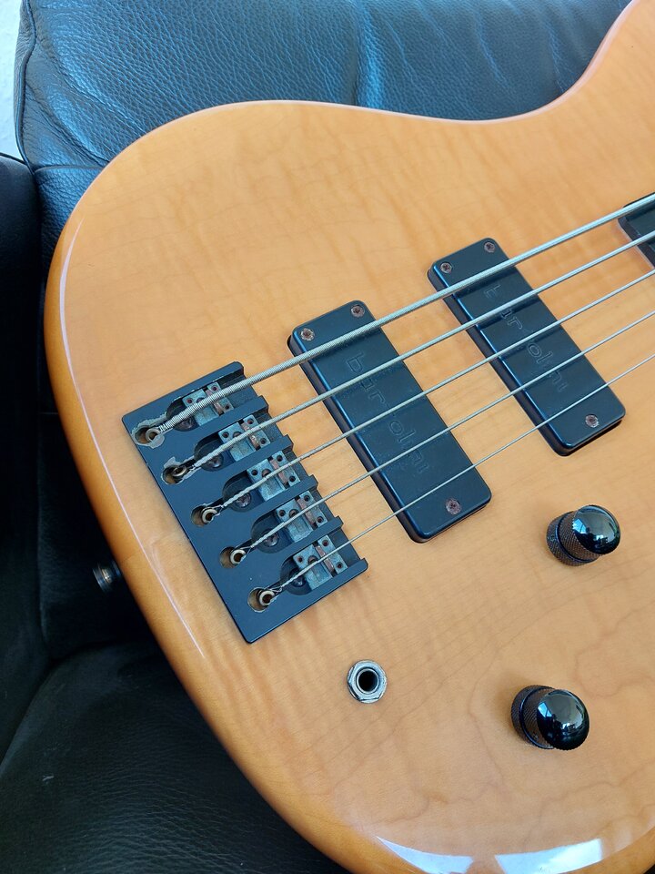 Schöner älterer BaseX Fretless, der möglicherweise mal bundiert war, jedenfalls sieht man bei genauem Hinsehen feine Linien im Griffbrett, die keine Einlagen sind. Spielt sich wunderbar und klingt, wie man es erwartet! Zwei Bartolini Soapbars, aktiver 2-Band EQ (abschaltbar). Halsbreite am Sattel sind 45 mm, Stringspacing aktuell ca. 19 mm, ist aber am etwas angelaufenen, aber funktionalen Steg justierbar. "Dank" des massiven (!) Riegelahorn-Bodies nicht eben ein Leichtgewicht, aber bestens ausbalanciert. Die typische Verschraubung ist mit einem sichtbaren Spalt ausgeführt, was aber Stabilität und Ton keinen Abbruch tut, aber erwähnt werden sollte.