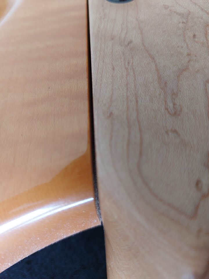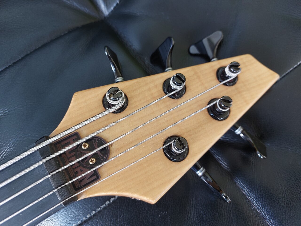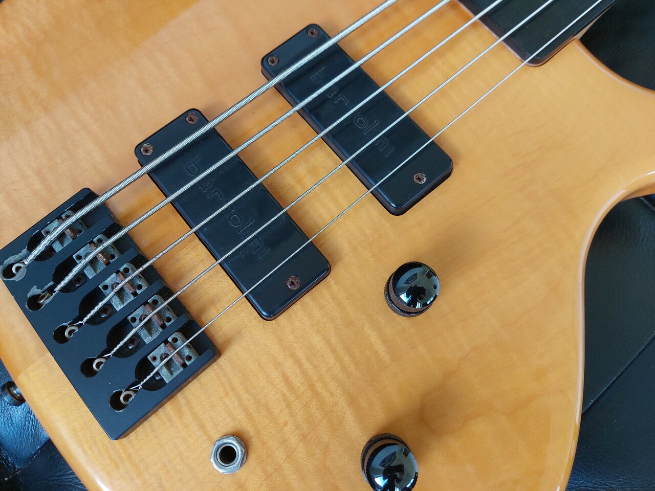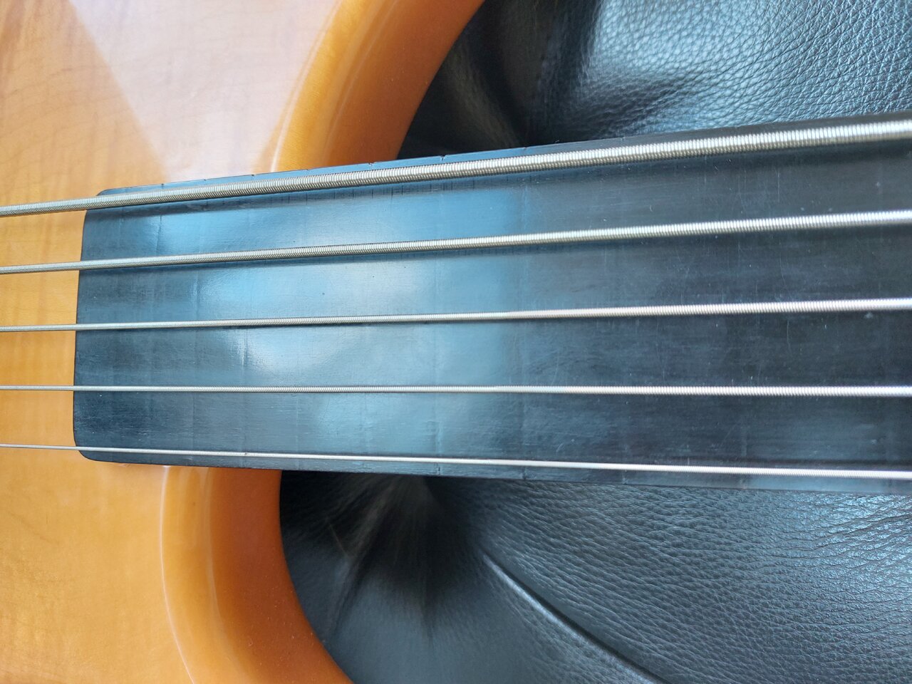 Schöner älterer BaseX Fretless, der möglicherweise mal bundiert war, jedenfalls sieht man bei genauem Hinsehen feine Linien im Griffbrett, die keine Einlagen sind. Spielt sich wunderbar und klingt, wie man es erwartet! Zwei Bartolini Soapbars, aktiver 2-Band EQ (abschaltbar). Halsbreite am Sattel sind 45 mm, Stringspacing aktuell ca. 19 mm, ist aber am etwas angelaufenen, aber funktionalen Steg justierbar. "Dank" des massiven (!) Riegelahorn-Bodies nicht eben ein Leichtgewicht, aber bestens ausbalanciert. Die typische Verschraubung ist mit einem sichtbaren Spalt ausgeführt, was aber Stabilität und Ton keinen Abbruch tut, aber erwähnt werden sollte.