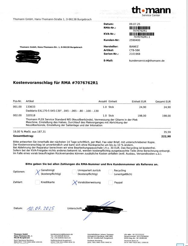 Bass wurde bei Thomann gePLEKt, (Rechnung vorhanden).