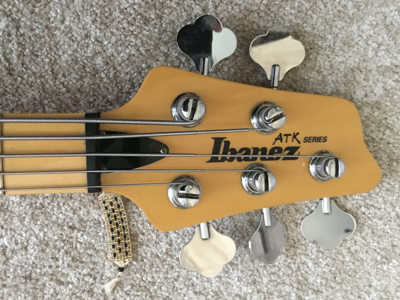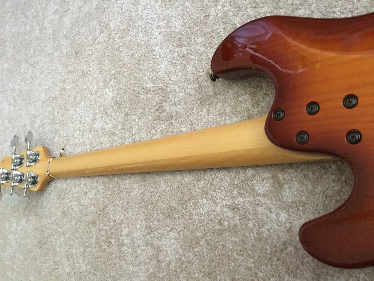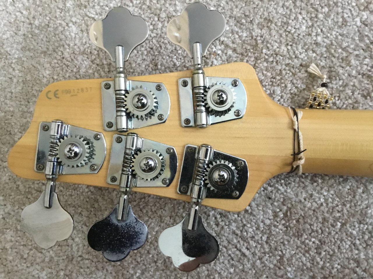 Optisch hat sie einen kleinen Lackfehler auf der Rückseite an der Kante beim Saitendurchzug (siehe Foto). Sonst nur minimale Gebrauchsspuren, kaum sichtbar.