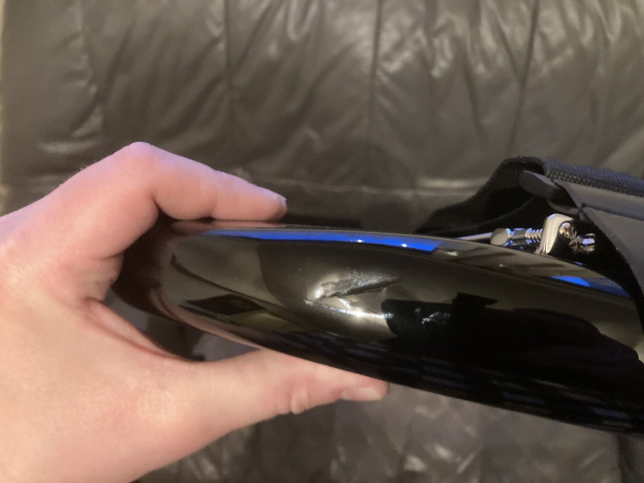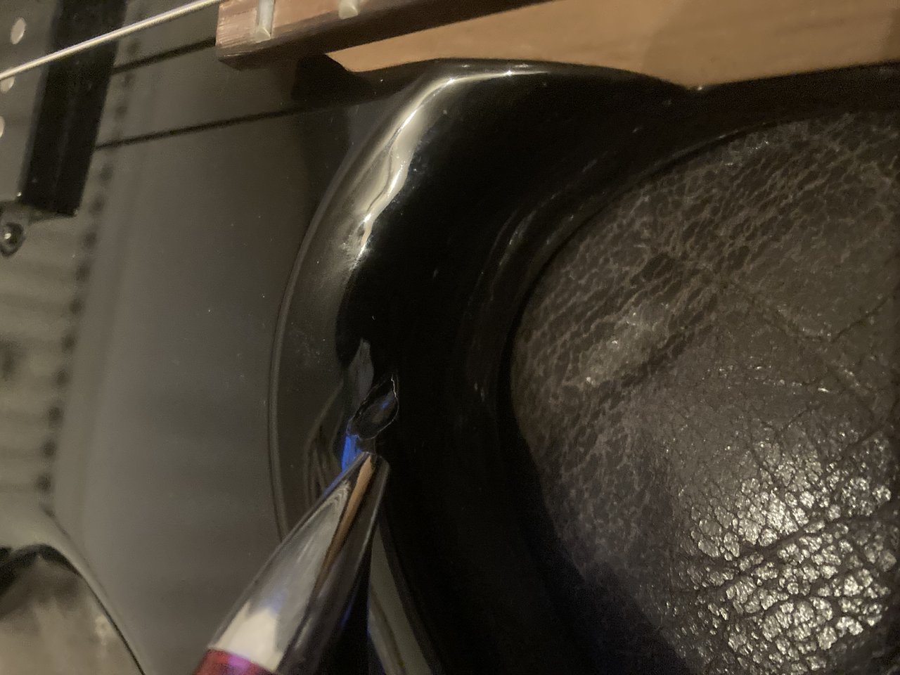 Der Bass hat leichte Gebrauchsspuren und zwei Dongs (siehe Fotos), einmal am unteren Horn innen und einmal am hinteren Ende. Der Funktion und dem Klang tut das keinen Abbruch, sind aber halt optische Mängel. Vor kurzem habe ich noch die Bridge und die Klinkenbuchse gegen original Ersatzteile ausgetauscht, da die verbauten defekt waren.