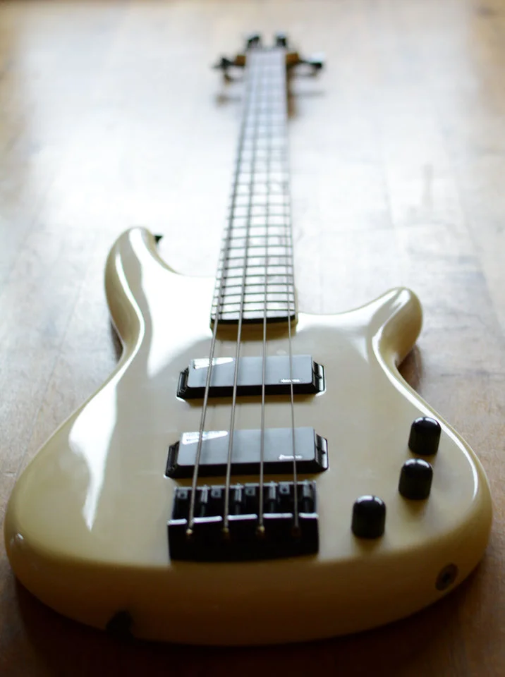 Ich habe den Bass als Jugendlicher Ende der 80er sehr wenig gespielt und extrem pfleglich behandelt, weshalb er immer noch wie neu aussieht und praktisch keine Kratzer oder Dellen hat. Sogar die Original-Aufkleber sind noch auf den Pickups. Das einzige was vor 20 Jahren einmal ausgetauscht wurde, war der interne 9V-Batterie Clip, nachdem die Batterie leicht ausgelaufen war. Das Weiß ist mittlerweile etwas vergilbt, was ihn wohl definitiv als vintage adelt
