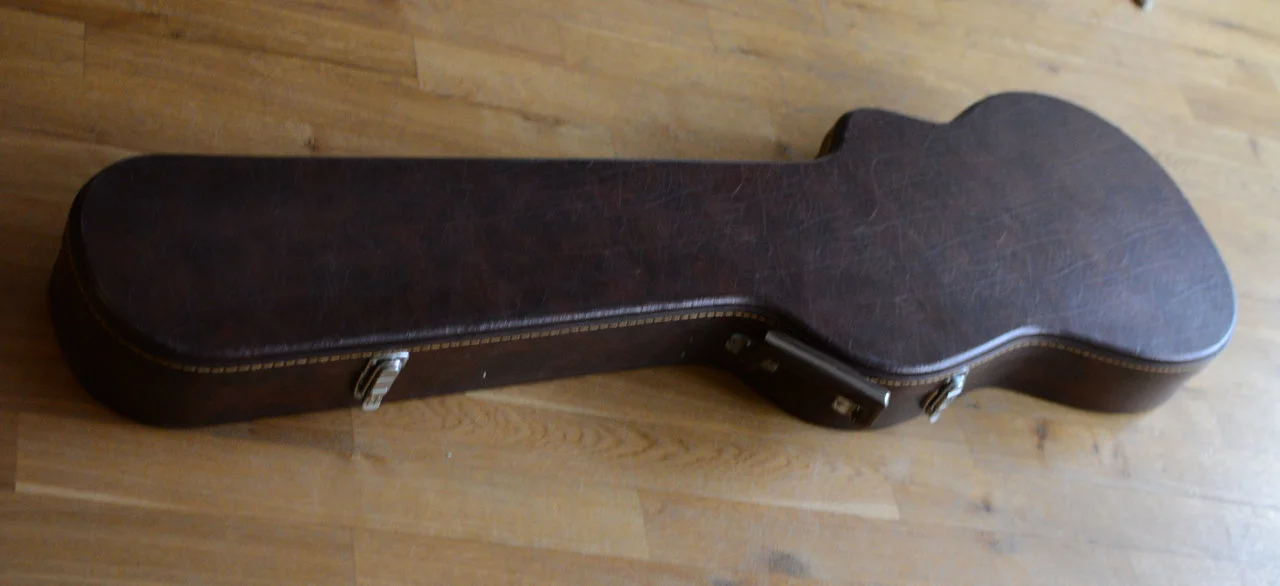 Mit dabei ist ein originaler, brauner Hartschalenkoffer mit exakter Passform für diesen Bass, der außen ein paar kleine Kratzer abbekommen hat - aber ebenfalls noch in einem ziemlich guten Zustand ist. Einzig eine Schnalle ist leicht verzogen (schließt aber noch komplett) und der Schlüssel ist nicht mehr vorhanden.