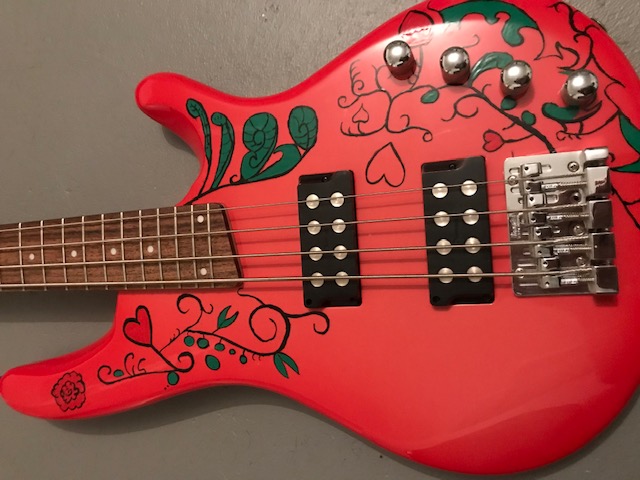 Ibanez Sound Gear Bass, geändertes Bodyshaping und Lackierung nach dem Vorbild der Hendrix Monterey Strat, Hardware original Ibanez, Einzelstück