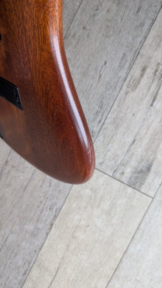 Der Mahagonikorpus hat ein paar Kratzer am Korpus (siehe Fotos, schon so gekauft, die Decke ist nicht betroffen), die mich persönlich aber nicht gestört haben. Ist halt ein Gebrauchsgegenstand.