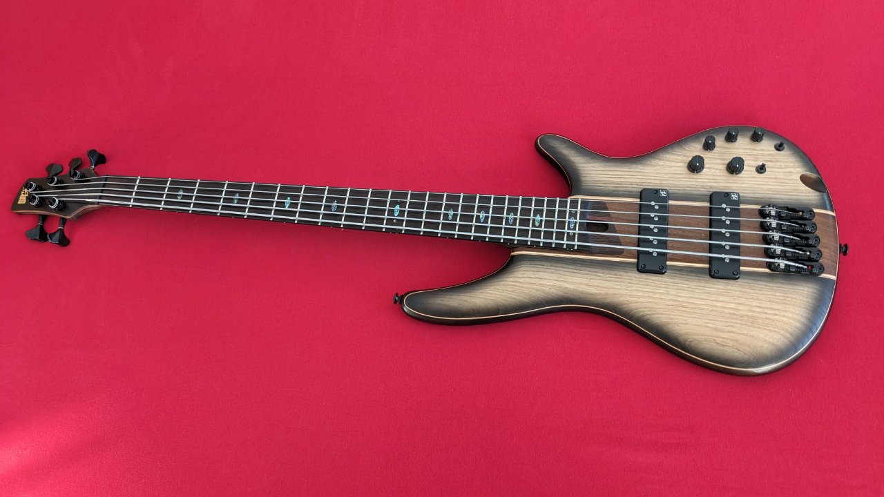 Ibanez SR1355B-DUF; 5-Saiter E-Bass; Korpus: Afrikanisches Mahagoni; Decke: Walnuss/PangaPanga/Ahorn; Hals: Fünfteilig PangaPanga/Purpleheart; Griffbrett: Eingefasstes PangaPanga; Halsbefestigung: geschraubt; Einlagen: Abalone oval; 24 Medium Bünde;...