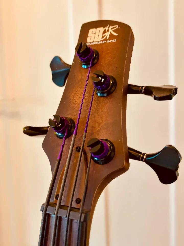 Er ist nicht zu 100 % im Originalzustand, weil die Mechaniken etwas in die Jahre gekommen waren. Mit den Gotoh Resolites ist der Bass wieder gut einstellbar und außerdem leichter geworden. Vom Vorbesitzer wurden andere Potiknöpfe montiert. Das Deckfurnier hat im Laufe der Jahre ein paar kleinere Macken und Abnutzungsspuren bekommen, siehe Fotos. Als Saiten sind frische LaBella Black Nylons aufgezogen. Insgesamt ist der Bass in einem mehr als ordentlichen Zustand.