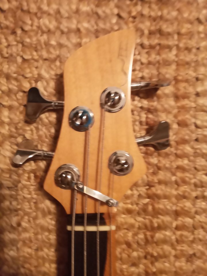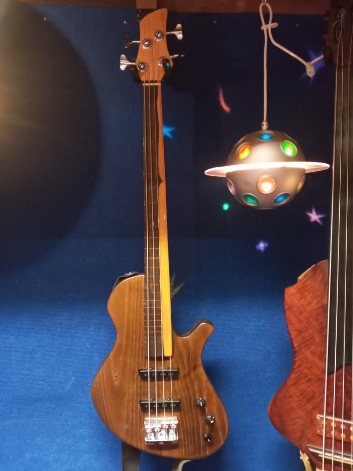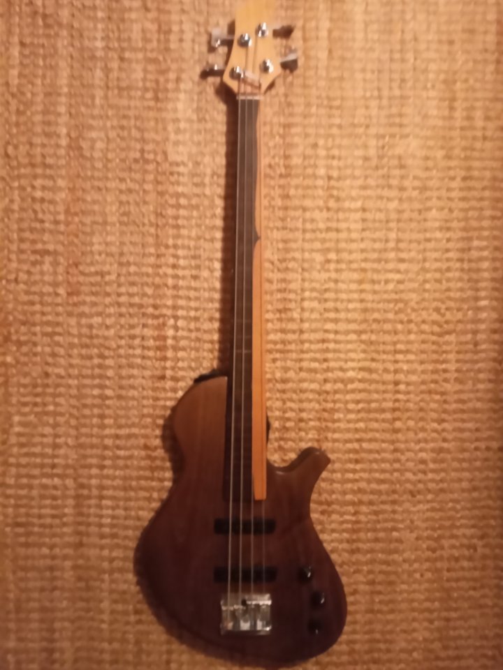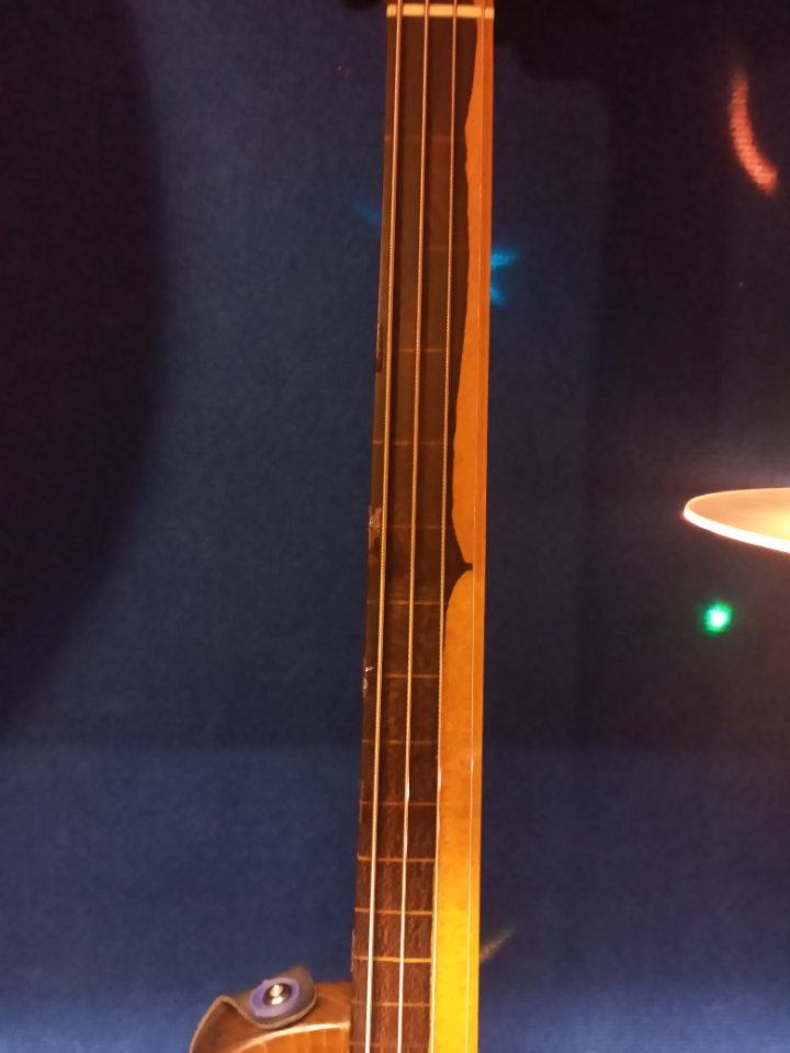 Hier ein schlanker, fast zierlicher, schnurrend-singender Fretlessbass. Die medium Mensur rundet diesen Eindruck ab. Bundmarkierungen und schlanker Hals lassen ihn in Kombination mit der Mensur zu einem leicht zu bedienbaren Bass werden.