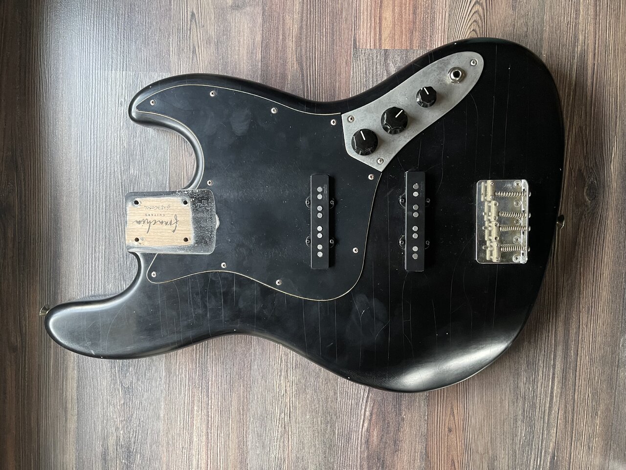 Der Korpus ist von Franchin Guitars und hat ein leicht mattes Nitro-Finish mit Cracks erhalten. Die Metallteile sind alle leicht geaged. Bei den Bestandteilen handelt sich um Neuteile aus 2023 und 2024. Ich habe die jeweiligen NP angefügt.
