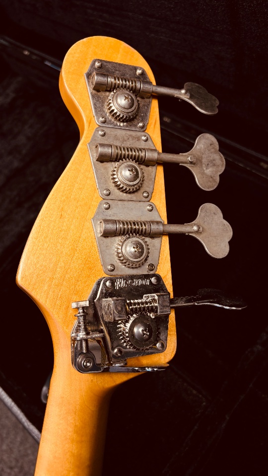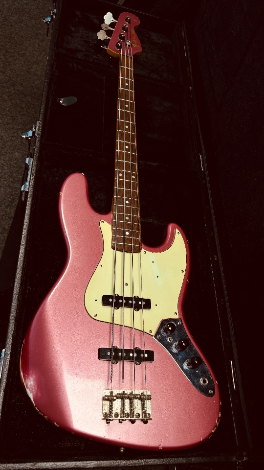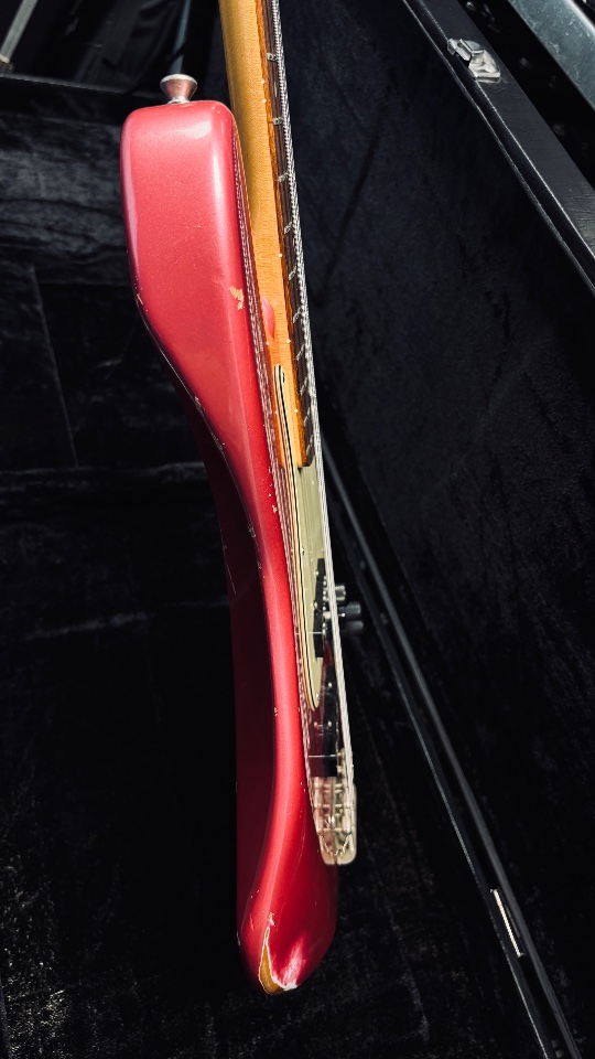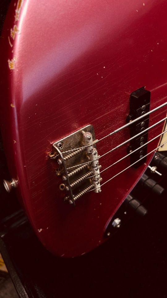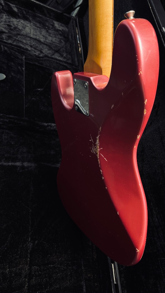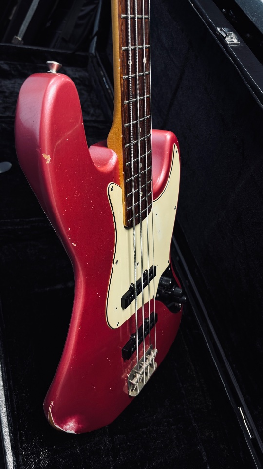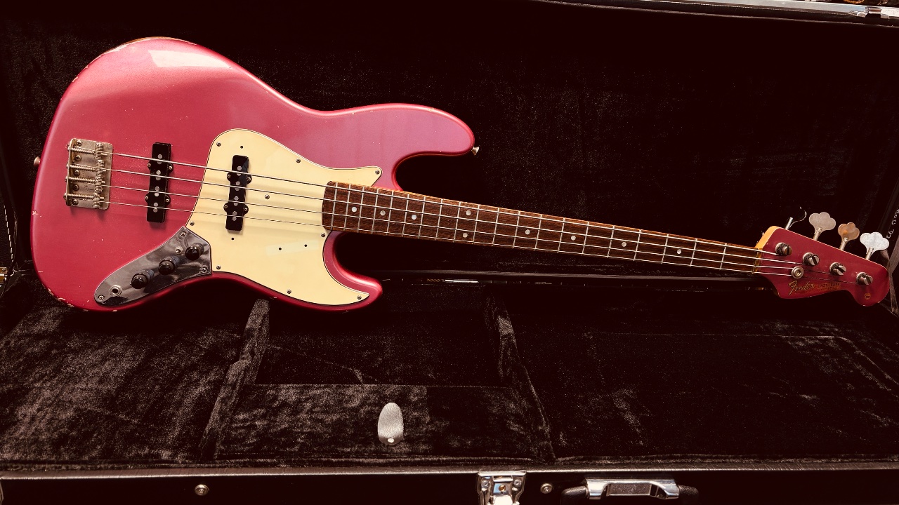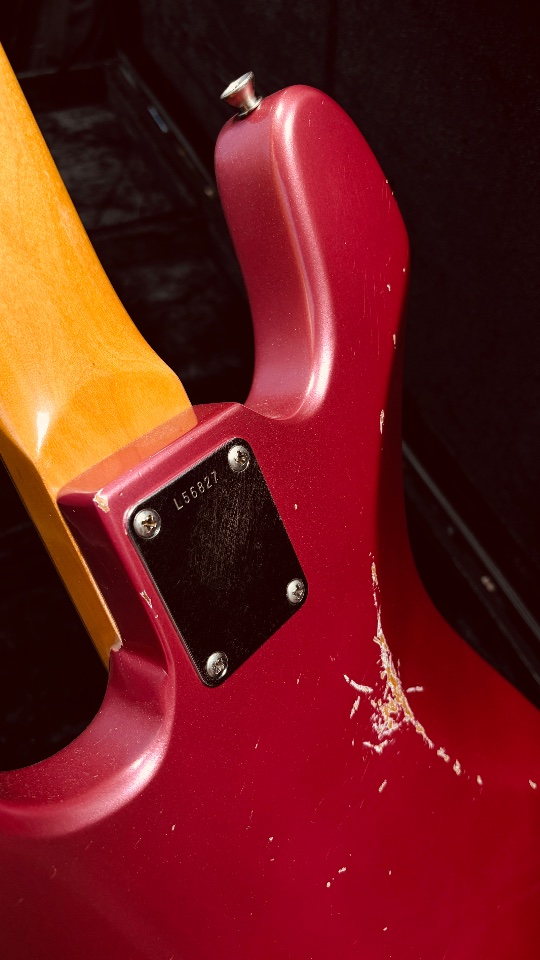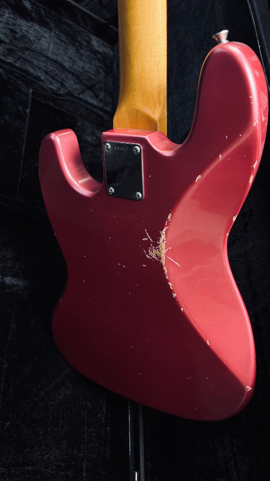 Dieser Jazz Bass aus der Herner Hillbrand Werkstatt im klassischen Burgundy Mist mit Matching Headstock, verkörpert das perfekte Zusammenspiel von Vintage-Charme und modernster Elektronik. Ausgestattet mit dem korrektem Vintage "F"-Logo und einer L-Number-Plate, zeigt dieser Bass alle typischen Merkmale eines wunderbar gealterten Instruments aus den 1960er Jahren.