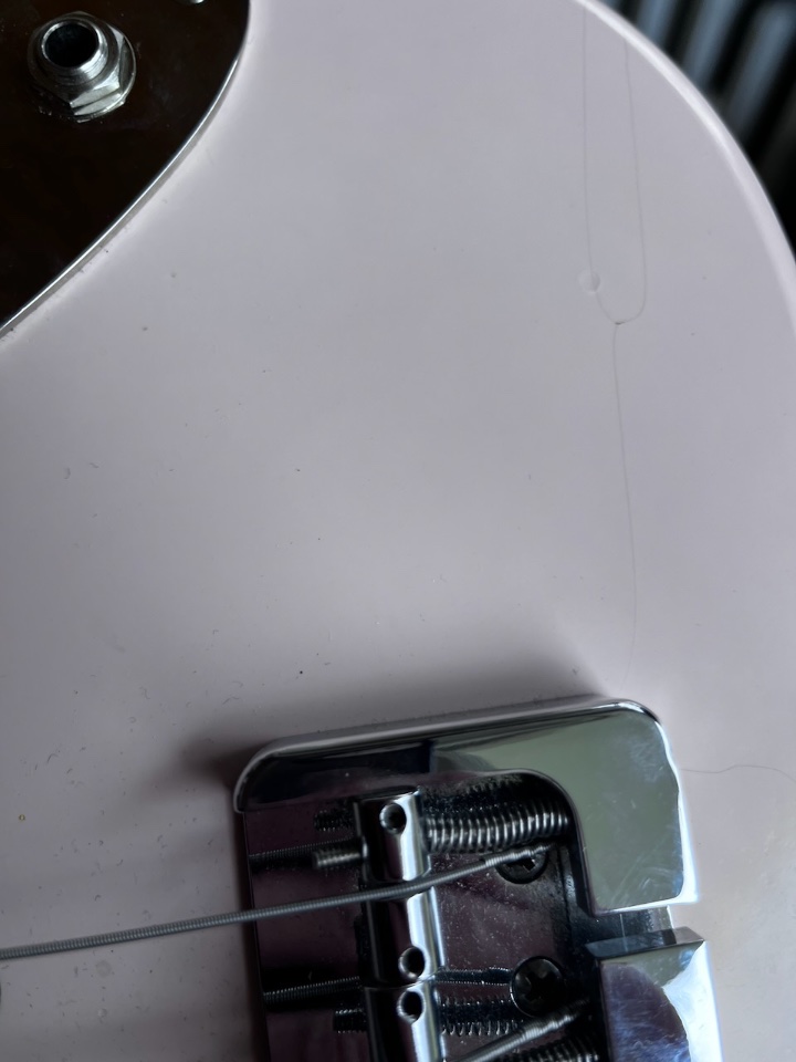 Der Bass hat von Haus aus ein leichtes, sehr dezentes Aging, was im wesentlichen aus leichten „Crackles“ im Nitro Lack besteht. Ein paar Macken sind bei den Gigs dazu gekommen, ich habe alle auf den Bilder dokumentiert. Sieht auf den Bilder schlimmer aus als es ist, finde ich.