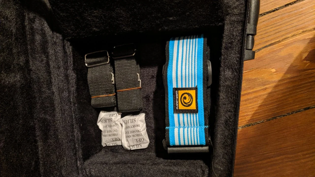 Teil des Angebots sind neben des Basses und des mitgelieferten Softcases noch ein passender Gurt von Planet Waves (siehe Foto) und ein ungeöffneter Satz neuer Saiten (~50,- bei Thomann).