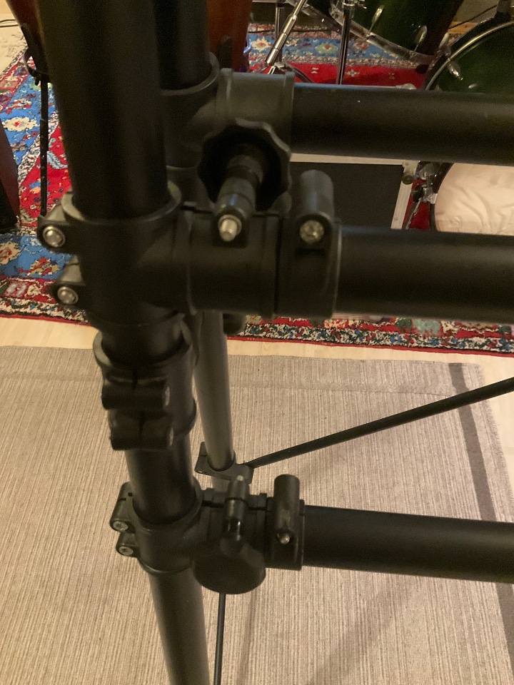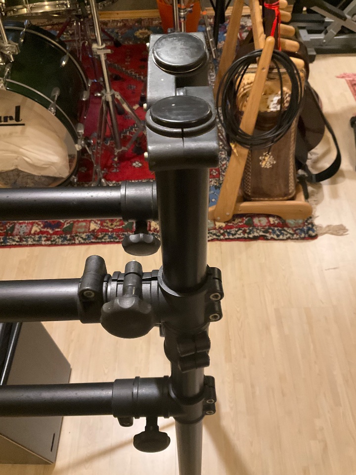 Pulverbeschichtetes Aluminium, ohne Kratzer. Stand immer im geheizten Proberaum,die meiste Zeit zusammengklappt in der Ecke und wurde nicht gebraucht , da noch ein Fender Rhodes im Einsatz war und ein Keyboard auf dem Rhodes stand, das hat für uns gereicht.