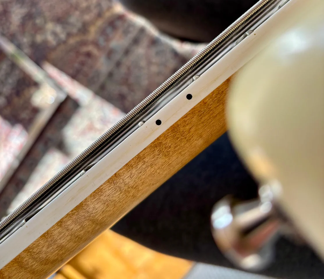 Knut scheint für den Halsradius die selbe Schablone über die gesamte Länge vom ersten bis letzen Bund zu nutzen. Da der Hals aber breiter wird ändern sich das Profil ständig und dies ist es, was mir (und wohl vielen anderen Spielern auch) negativ auffällt. In den ersten Lagen bis zum 5. Bund war es immer ok, natürlich fett und dick aber nichts woran man sich nicht gewöhnen kann, in den mittleren Registern fand ich den Bass dann immer sperrig und unangenehm zuspielen und ab Bund 12 ging es dann wieder. Nico Schack hat genau dies nachgearbeitet, den Hals insgesamt dünner gemacht und das Profil so angeglichen das nun über alle Lagen der gleiche Radius vorhanden ist. Knut argumentiert die Dicke seiner Hälse oft mit der Stabilität, Nico ist aber ebenso Fachmann der bei niemand geringeres als Tom Launhard gelernt hat und qualitativ in der allerhöchstenLiga spielt. Er versicherte mir da es überhaupt keine Problemed iesbezüglich gibt und ich glaube ihm das auch bedenkenlos. Nach einem Jahr ist alles in bester Ordnung, der Bass spielt sich nun wie Butter, hat immer noch einiges an Fleisch und würde zu den dickeren Profilen irgendwo zwischen "D" und "C" mit Tendenz zum "D" zählen. Dazu hat er die Bünde nochmal nachgearbeitet und nun lässt sich eine ultraflache Satenlage ohne jegliches Schnarren verwirklichen - siehe Foto. Die Bespielbarkeit ist nun ein echter Traum, der kleine Eingriff hat sich total gelohnt, das geölte Finish fühlt sich genau so an wie das originale vonKnut, einfach nun so wie es immer sein sollte. Nico Schack steht diesbezüglich auch gerne zu einer Auskunft bereit wer das alles nochmal vom Fachmann erklärt bekommen haben möchte.