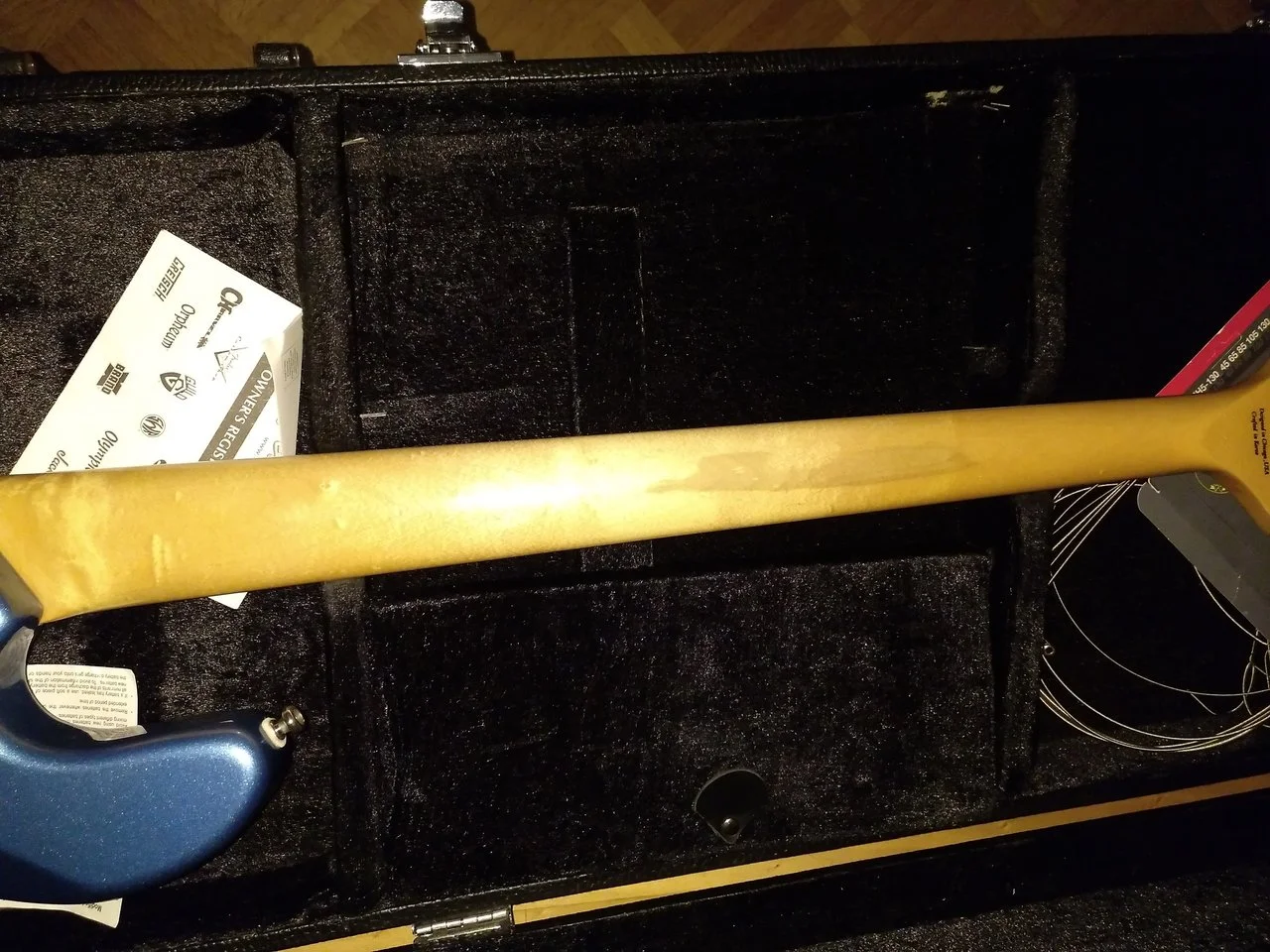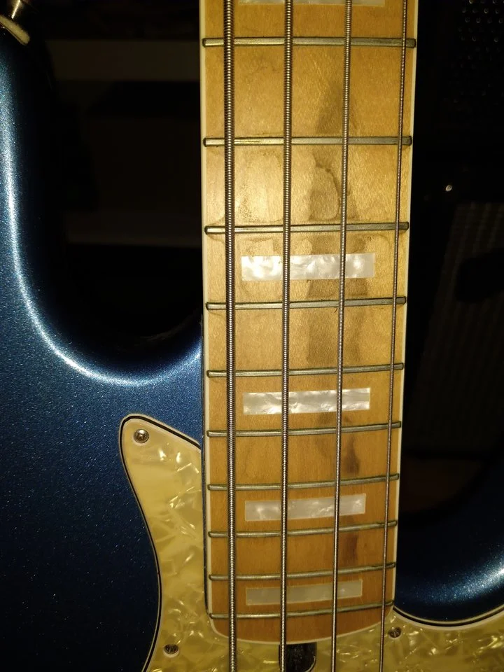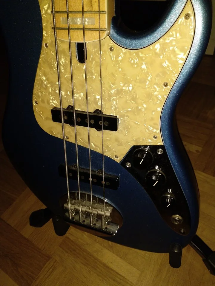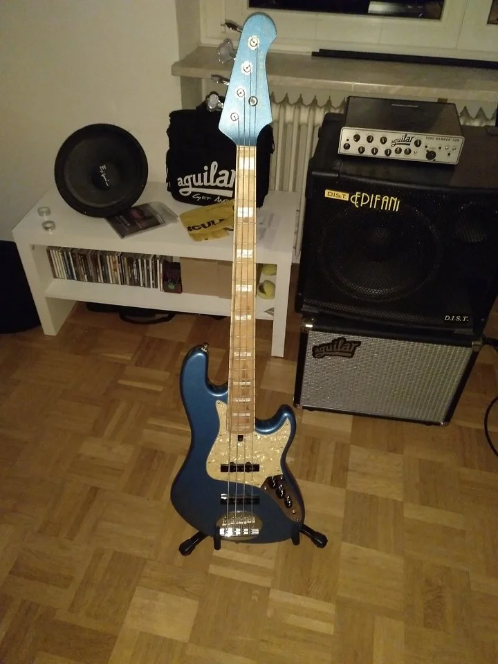 Soundmäßig kann man hier echt was erwarten. Klarer, punchiger Jazzbass-Sound, mit ordentlichem Durchsetzungsvermögen. Er hat zwar ein paar Verfärbungen am Hals (siehe Fotos), jedoch ändert das weder etwas am Sound noch an der Bespielbarkeit. Er spielt sich mühelos und hat keine toten Bünde etc. Anspielen erwünscht