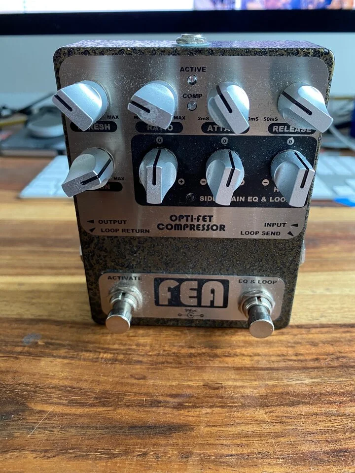 less than the commonly used method of connecting the battery’s negative terminal to ground via the sleeve of the plug inserted into the INPUT jack. The “switch on” sensing method used in the FEA OPTI-FET Compressor keeps nearly all of the circuit’s generated white noise and transient currents out of the INPUT stage signal ground. Extreme measures have been taken to keep the power and signal paths as clean as possible.