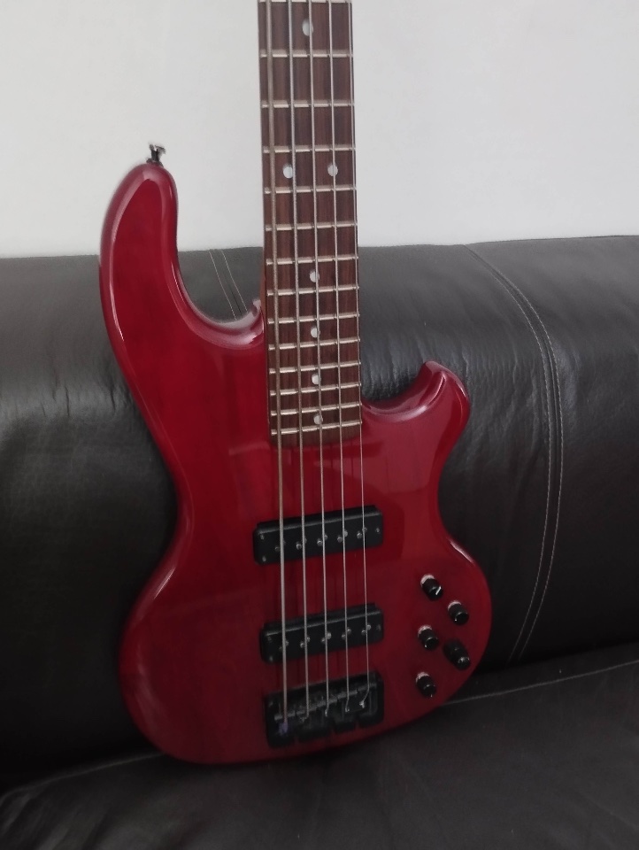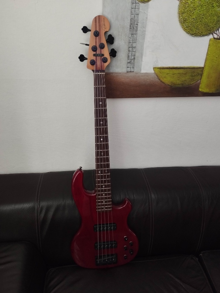 Der Bass fällt optisch eher dunkler (Richt Weinrot) aus. Bild 1 kommt dem am Nächsten. Es sind minimale Gebrauchsspuren auf der Rückseite des Instruments, die auf den Bildern eigentlich auch nicht zu erkennen sind.