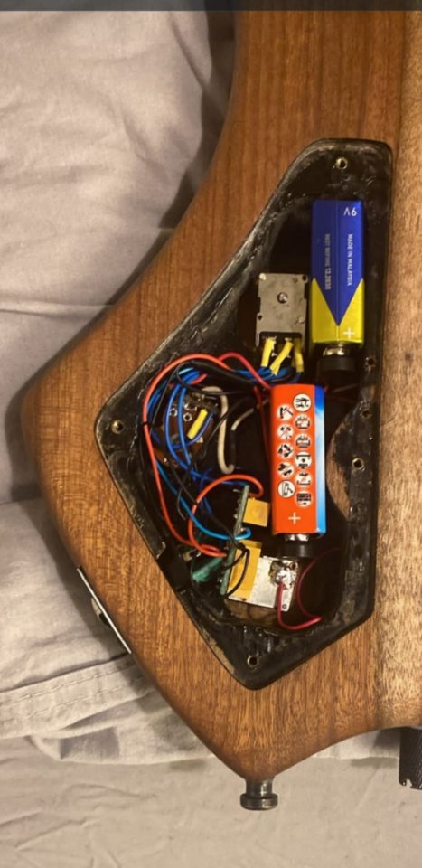 (OHNE POTIEKNÖPFE!) Bass von mir hinzugefügt. Mein Tech verdrahtet gerade neu während ich hier schreibe. Morgen (Sa 7.2.) fertig, sagt er. ICH GEBE aA PLASTIKKNÖPFE DAZU, kann aber nicht versprechen das die 100% auf die Achse passen und das stacked Potie braucht dann eh'n unteren Ring