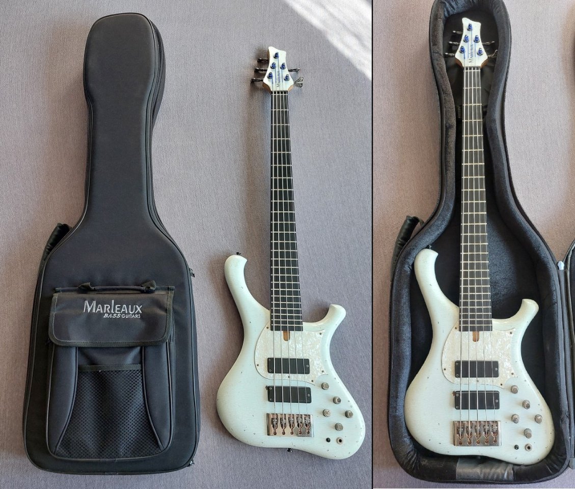 Es handelt sich dabei um eines der raren Marleaux Instrumente, welches optisch nicht den Stil eines "Edelbasses" verfolgt sondern mit einem aufwendigem Ageing versehen ist um jahrzehntelange Rock- und Bühnenerfahrung zu imitieren.