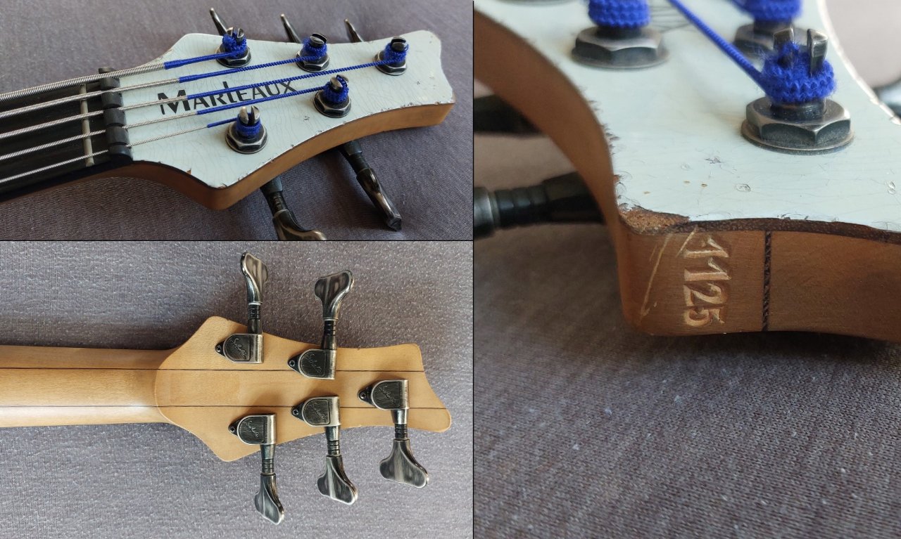 Dies ist alles original von Marleaux so gefertigt. Wenn ihr auf der Marleaux-Facebook-Seite nach "Consat Classic" sucht, findet ihr auch Fotos dieses Instrumentes. Soweit ich dort sehen kann, wurde neben meinem babyblauen Consat Classic zumindest noch ein weiteres 5-Saitiges Exemplar in olympic white gefertigt. Ansonsten finde ich im Netz keine weiteren Hinweise darauf, dass es weitere Exemplare dieser gealterten Consats gibt.