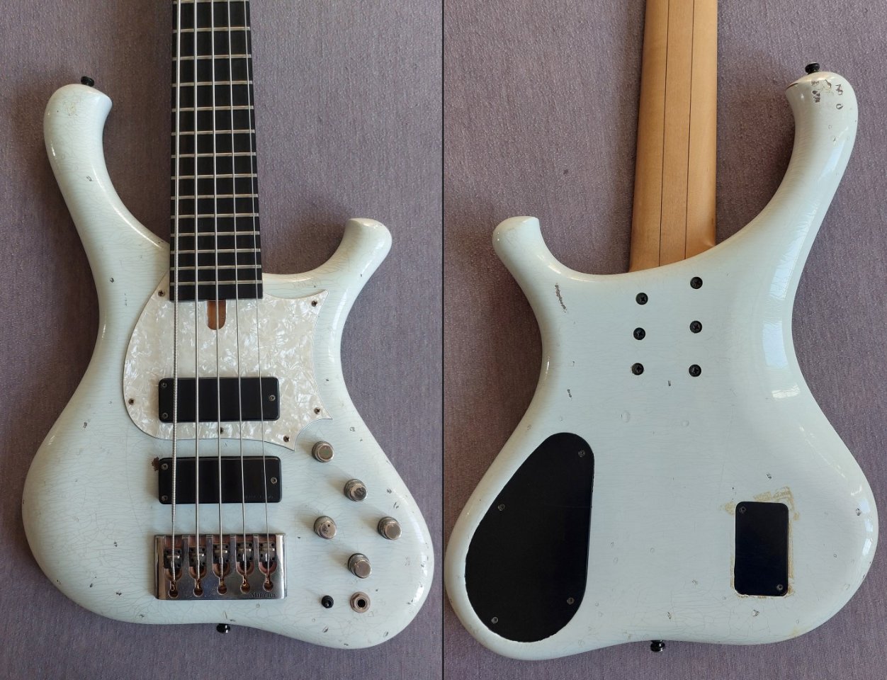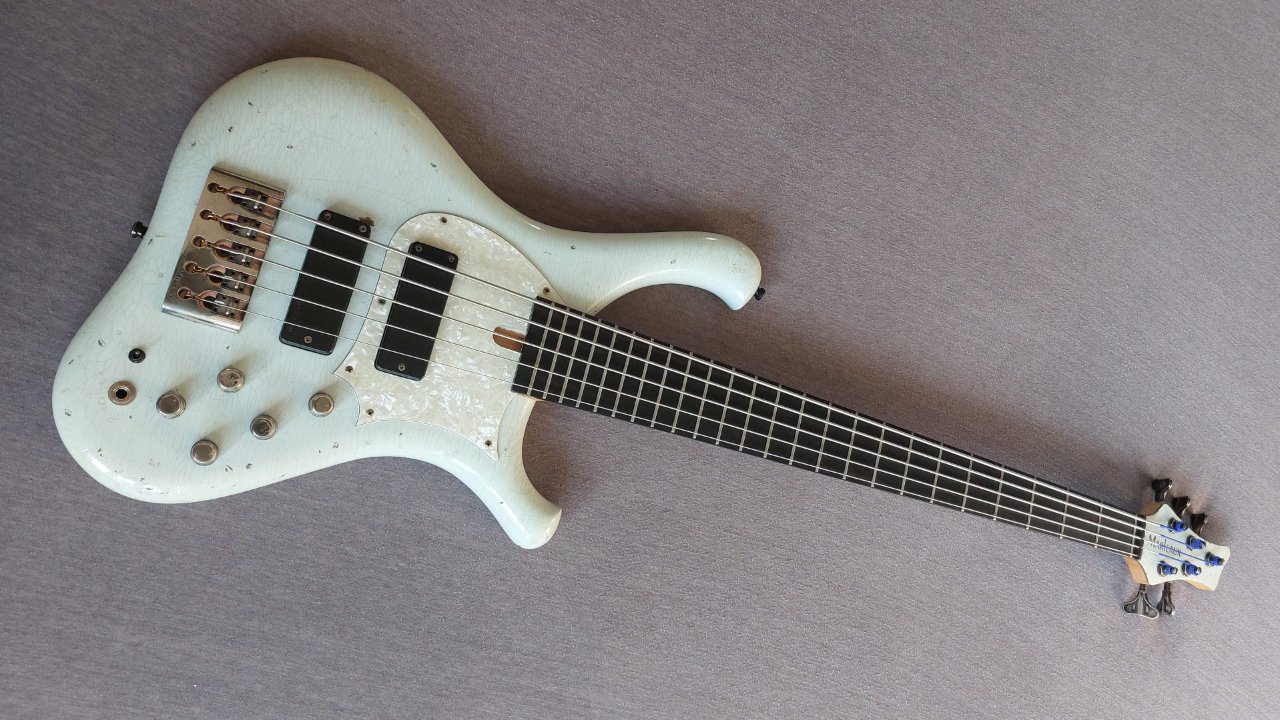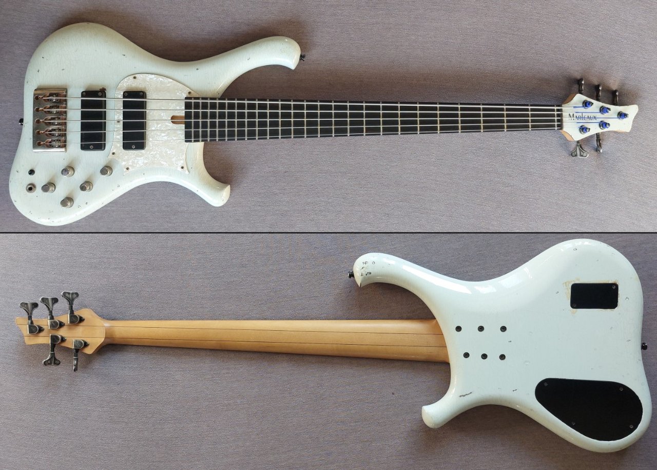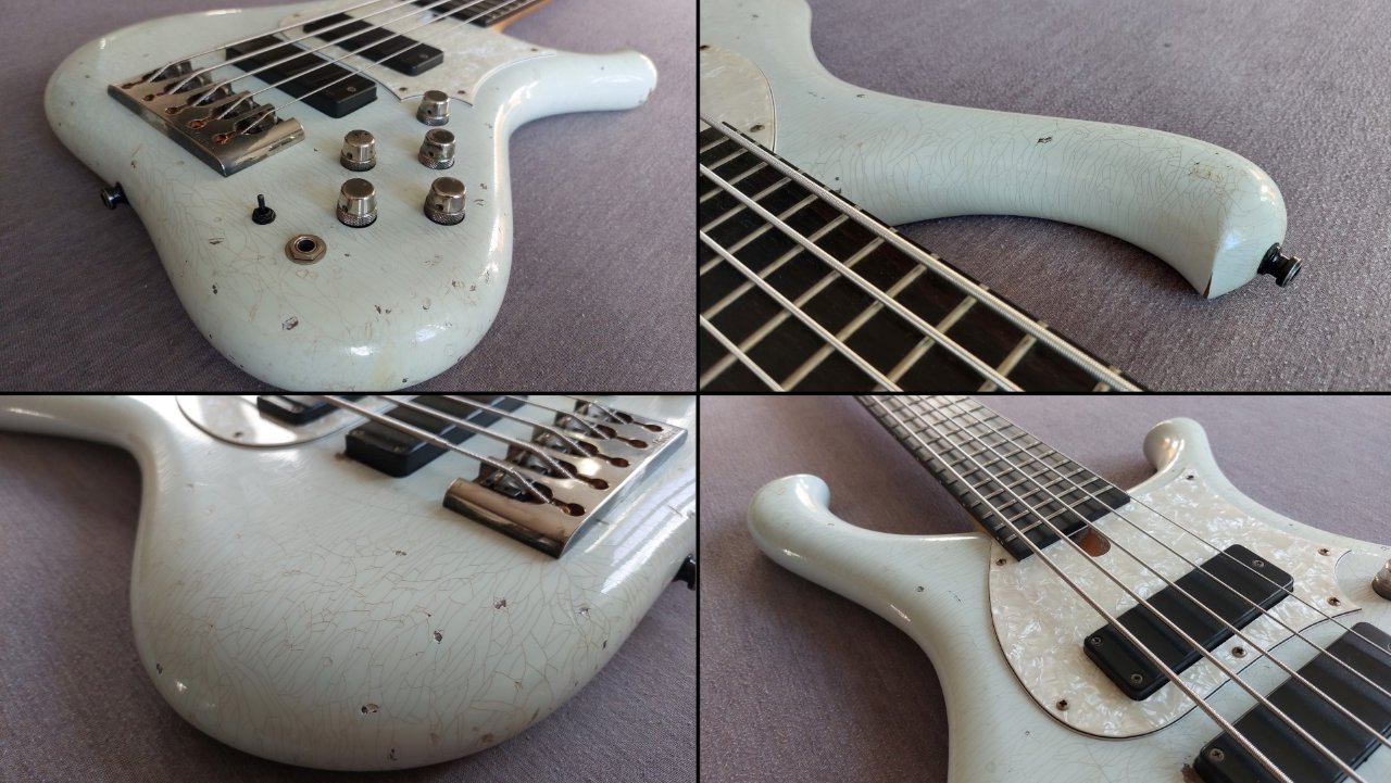 Es handelt sich dabei um eines der raren Marleaux Instrumente, welches optisch nicht den Stil eines "Edelbasses" verfolgt sondern mit einem aufwendigem Ageing versehen ist um jahrzehntelange Rock- und Bühnenerfahrung zu imitieren.