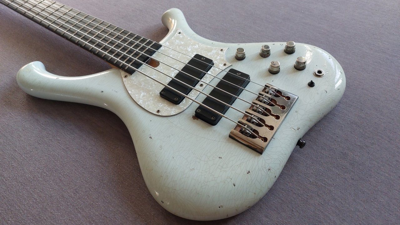 Der hellblaue Lack des Basses zeigt ein feines Rissmuster, wie es bei alternden Nitro-Lackierungen auftritt. Auch die Hardware und das Pickguard wurden geaged so dass sich ein wirklich authentisches Gesamtbild ergibt. Selbst am Batteriefach wurde das Instrument so gestaltet, dass es aussieht, als wären dort Rückstände von Klebeband