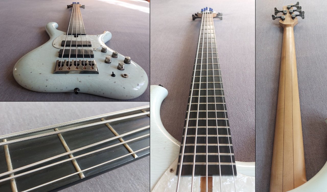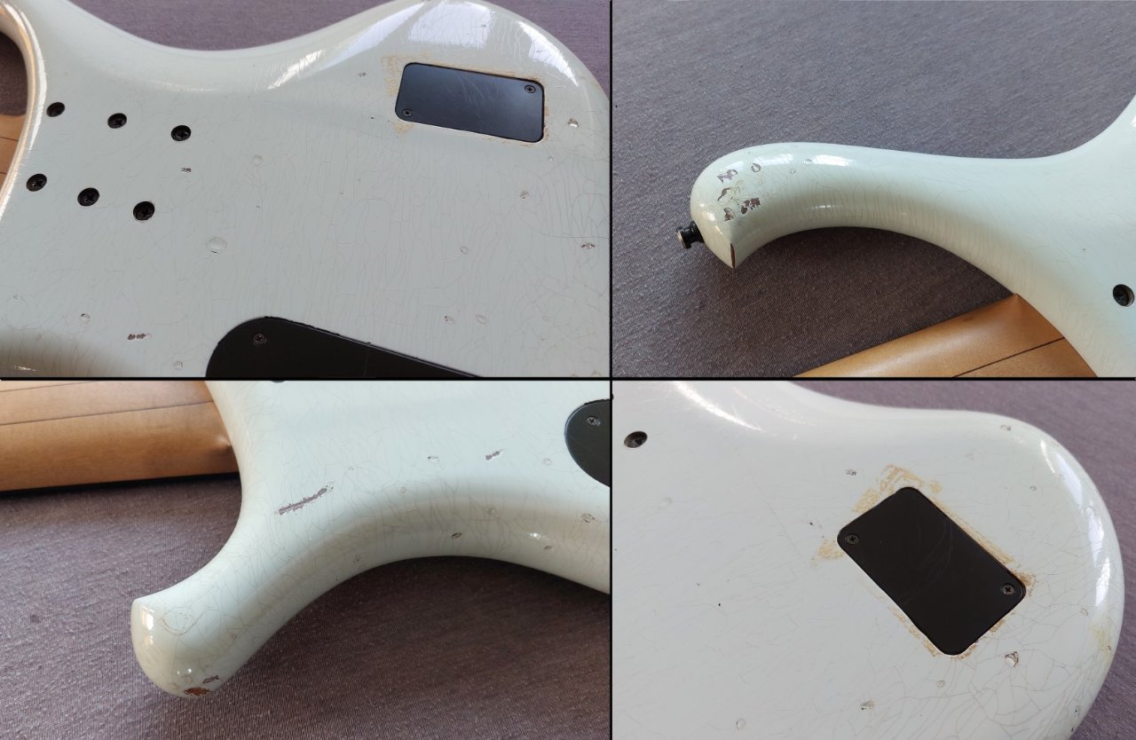 Dies ist alles original von Marleaux so gefertigt. Wenn ihr auf der Marleaux-Facebook-Seite nach "Consat Classic" sucht, findet ihr auch Fotos dieses Instrumentes. Soweit ich dort sehen kann, wurde neben meinem babyblauen Consat Classic zumindest noch ein weiteres 5-Saitiges Exemplar in olympic white gefertigt. Ansonsten finde ich im Netz keine weiteren Hinweise darauf, dass es weitere Exemplare dieser gealterten Consats gibt.