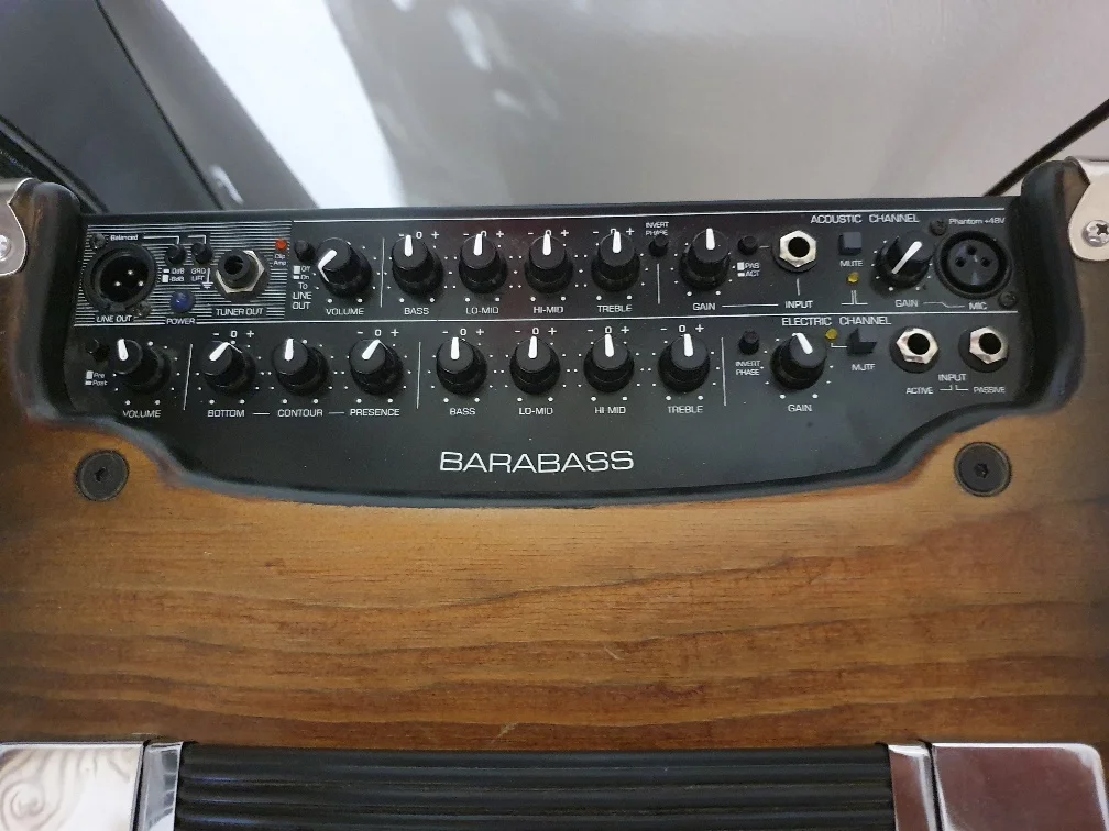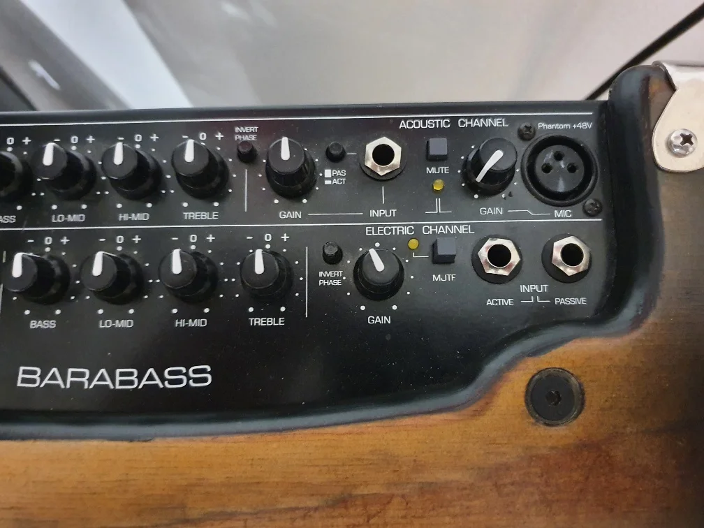 Preamp Acoustic Channel: Mic/Jack Input, Invert Phase, Treble, Lo-Mid, Hi-Mid, Bass