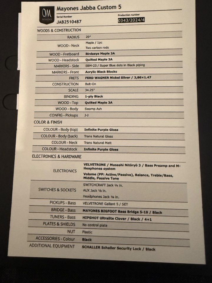 Alle Zertifikate, Spec-Sheets usw. sind erhalten und der Bass wird im originalen, hochwertigen Factory-Gigbag von Mayones verkauft!