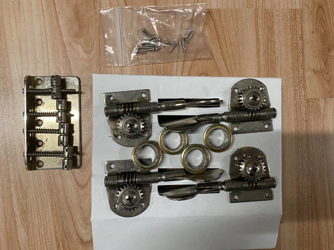 da ich doch eher der "blink-blink Typ bin, habe ich diese gäitschten Teile über. 4 mal Mechanik, passend für Fender und fenderstyle Bässe. Inkl Schrauben und Hülsen und eine simple Blechwinkelbrücke (Brücke ohne Schrauben).
