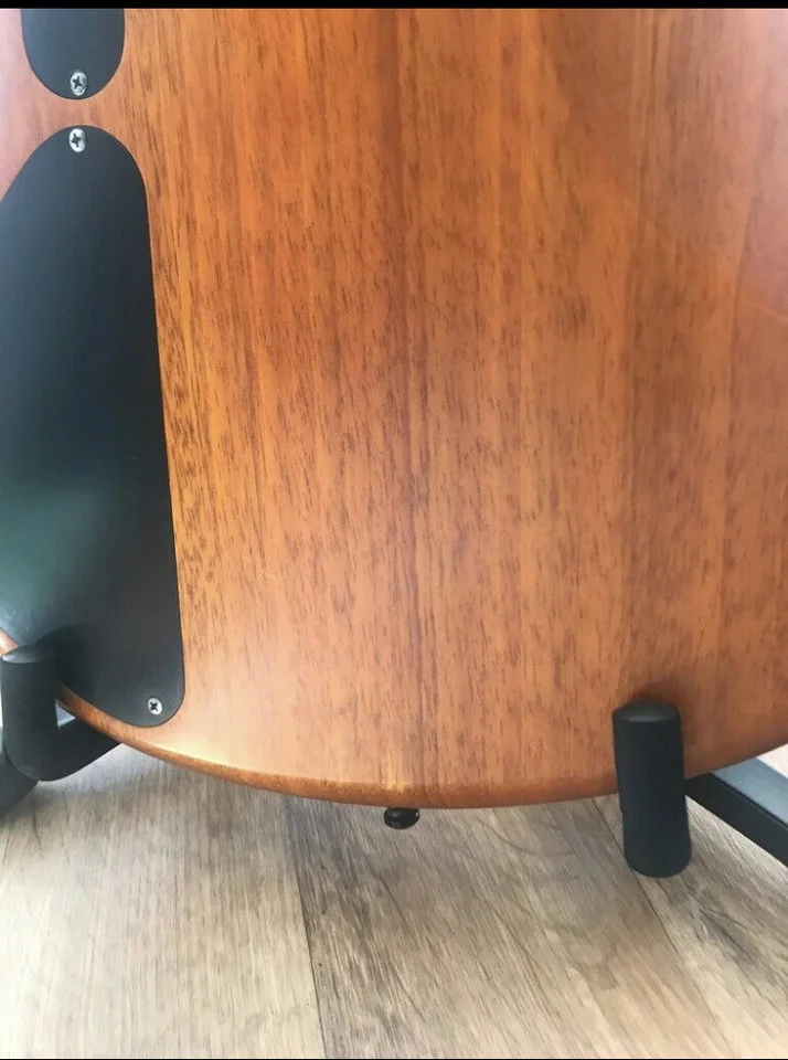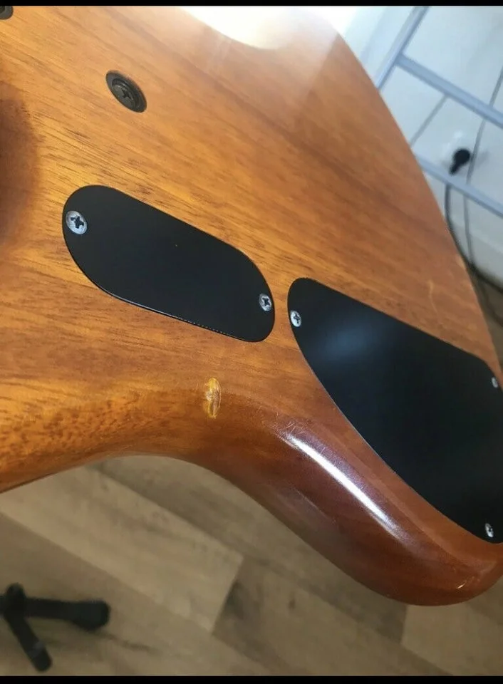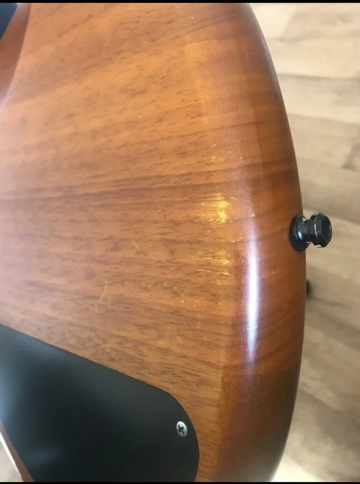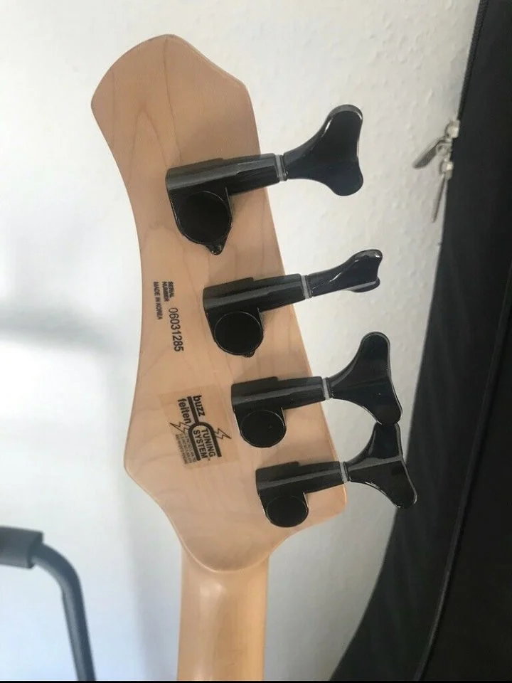 Zum Zustand: Der Bass wurde gespielt und weist deshalb Gebrauchsspuren auf. Er hat am Korpus zwei Macken und auf der Rückseite sind besonders im unteren Bereich einige Kratzer (siehe Bilder). Ansonsten beschränken sich die Spuren auf oberflächliche, "normale" Spielspuren. Der Bass wurde immer gepflegt und wird von den Mängeln in keinster Weise in der Funktion beeinträchtigt. Er ist gebraucht aber nicht abgerockt.