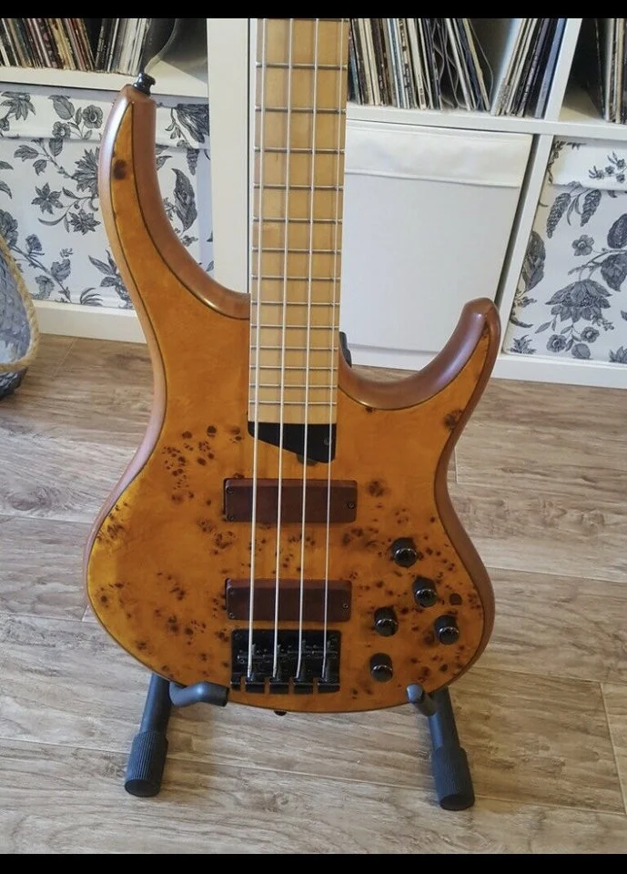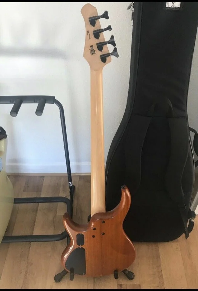 Die Elektronik arbeitet super und ohne Nebengeräusche. Man kann den Sound sehr gut in verschiedene Richtungen bewegen, aber der Bass behält immer seinen Charakter. Durch den asymmetrisch gerundeten Hals, lässt sich der Bass in allen Lagen bequem bespielen. Trotz Mahagonikorpus wiegt er nur ca. 3,5 kg.