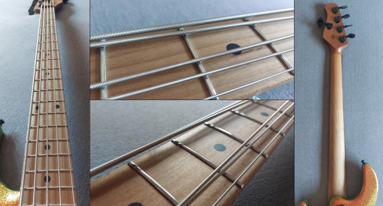 Die Elekronik tut ihren Dienst ohne Knacken, Kratzen oder Ausfälle. Die Darkglass Verzerrung funktioniert wunderbar. Der Halsspannstab verrichtet seinen Dienst leichtgängig und es lässt sich durch die super abgerichteten Bünde wirklich eine hervorragend flache Saitenlage einstellen. Auch die ultralight Mechaniken funktionieren natürlich einwandfrei. Das Instrument hat keine Bühne gesehen und wurde wirklich sehr pfleglich behandelt. Auf dem Pickguard sieht man natürlich ganz leichte Spielspuren, ansonsten ist der Bass aber wirklich wie neu. Selbst an den Edelstahl-Bünden sind keinerlei Spuren zu sehen (siehe Foto).