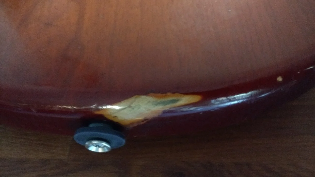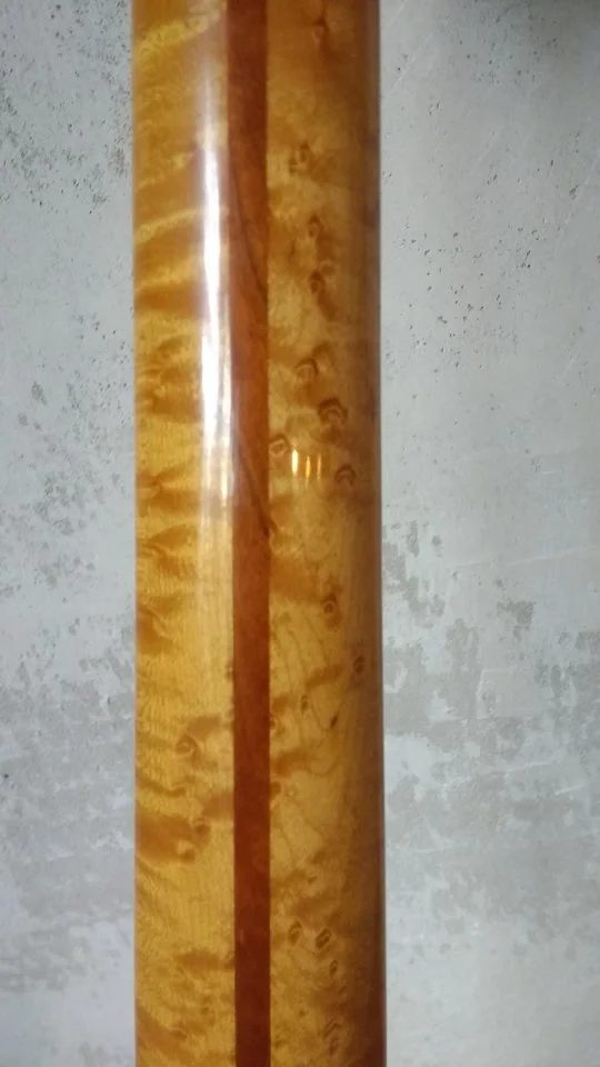 Korpus ist aus einem Stück, Lackierung in Rosewood, Hals aus Vogelaugenahorn, D-Tuner.