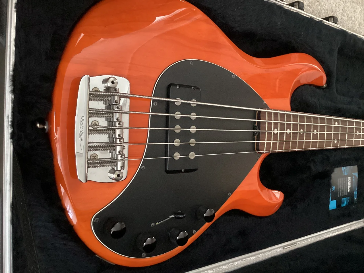 Die Elektronik ist eine aktive Music-Man-Schaltung mit Reglern für Lautstärke, Bässe, Mitten und Höhen. Der Schalter bietet drei Positionen: Spulen 1 und 2 parallel, Single-Coil + Phantom-Coil und Spulen 1 und 2 in Reihe geschaltet. Alle Positionen sind brummfrei. Alle Regler liefern sehr musikalische Klänge. Die Tonabnehmer verfügen über Keramikmagnete. Die B-Saite klingt straff und artikuliert. Ich habe keine Informationen zur Saitenmarke; die Stärke scheint 0045-0130 zu sein.