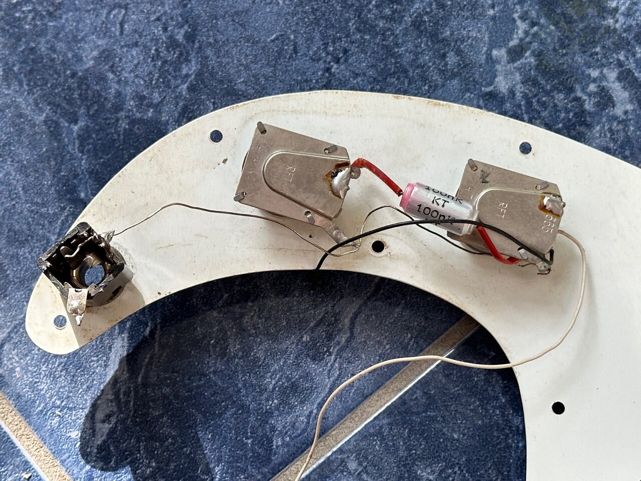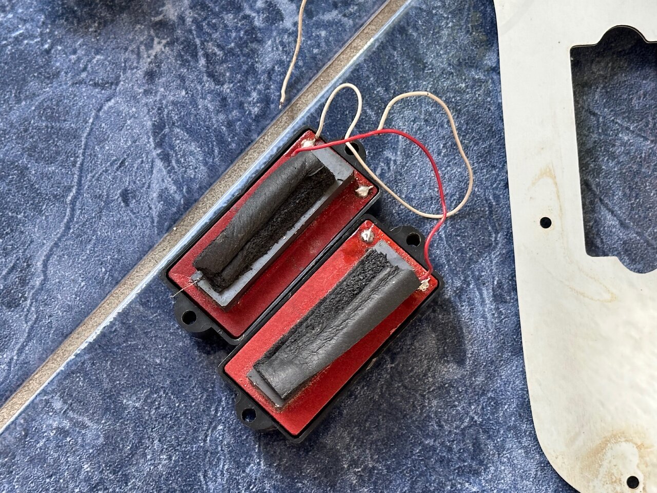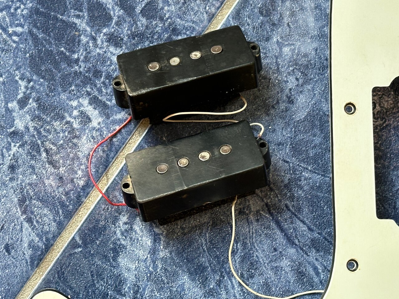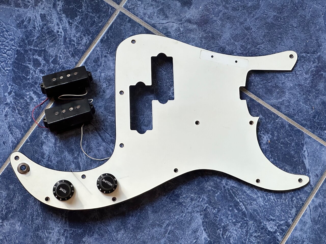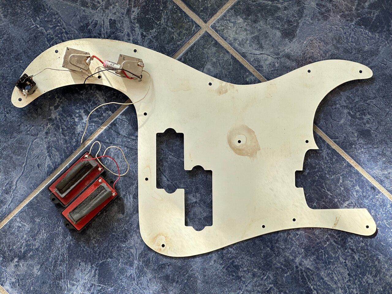 Biete diverse Teile für einen Musima Action Bass, DDR 80er Jahre: Pickguard, original Potis mit Knöpfen, Buchse und Pickup. Die Verkabelung ist unvollständig, aber die Pickupspulen sind intakt: Ich habe die einzelnen Spulen mit 2,77 bzw. 2,78 kOhm gemessen.