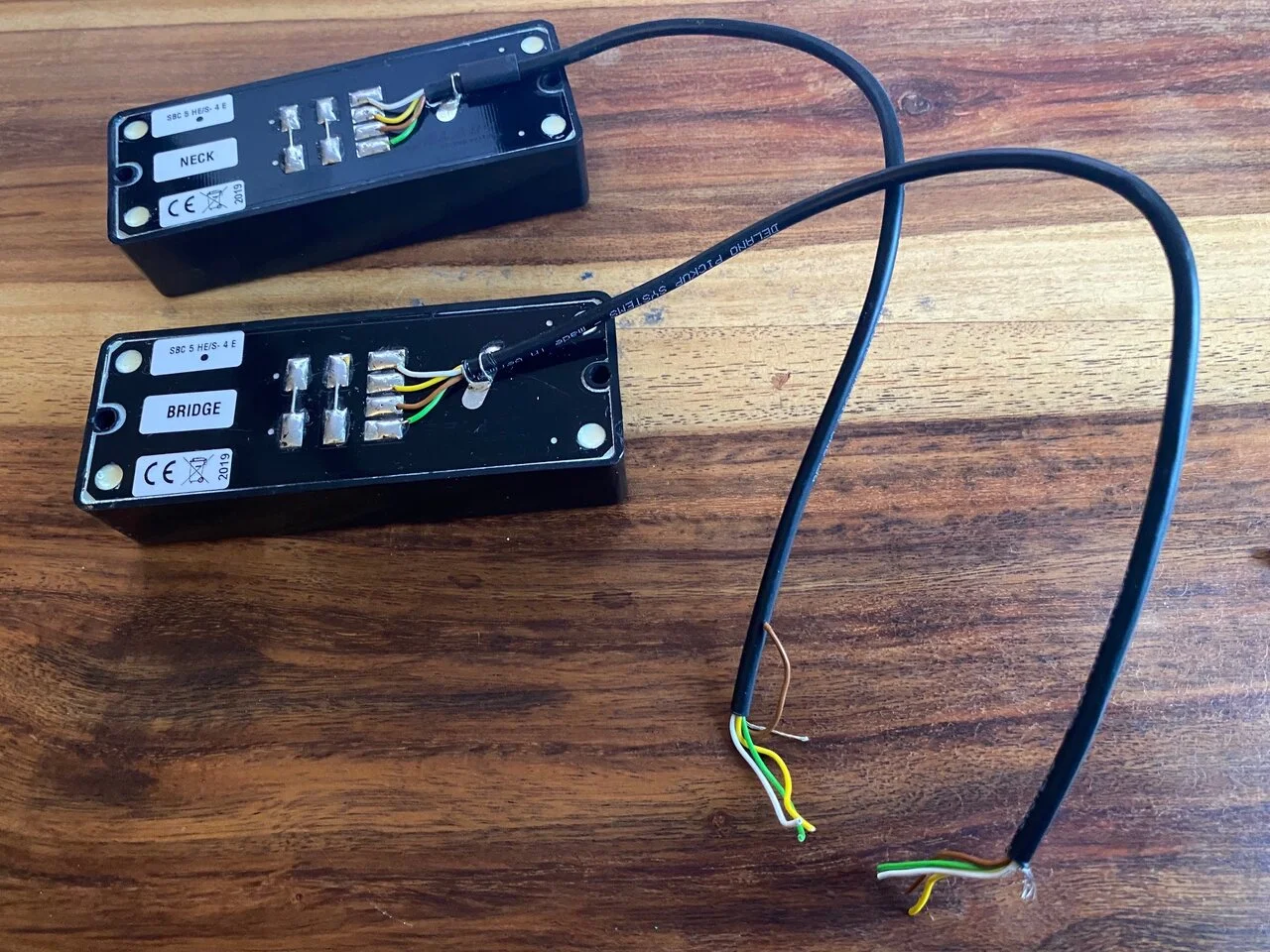 Our SBC 5 HE/S-4 E quad coil 5-string bass transducer is a serious multi-tonality monster. The same big dimensional 5-string sound our standard SBC 5 HE/S-E pickups are famous for, and many useful humfree tones on top through additional wiring and coil sensing options. Great P-cross coil...