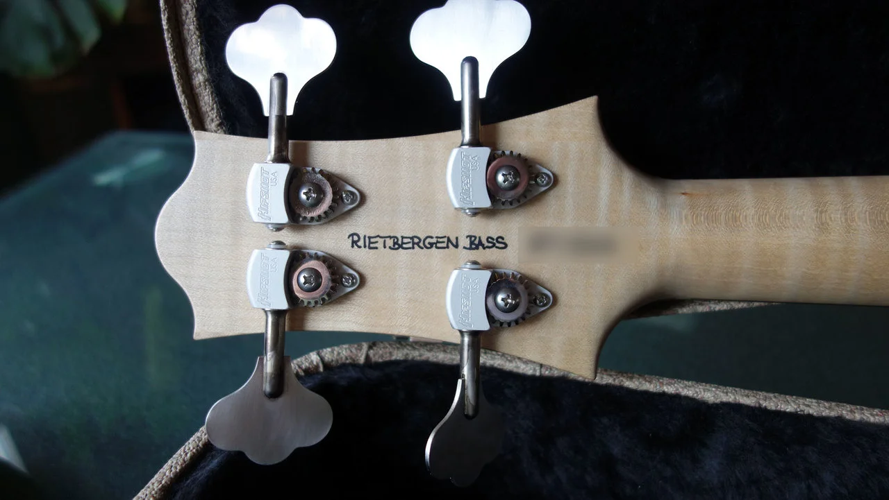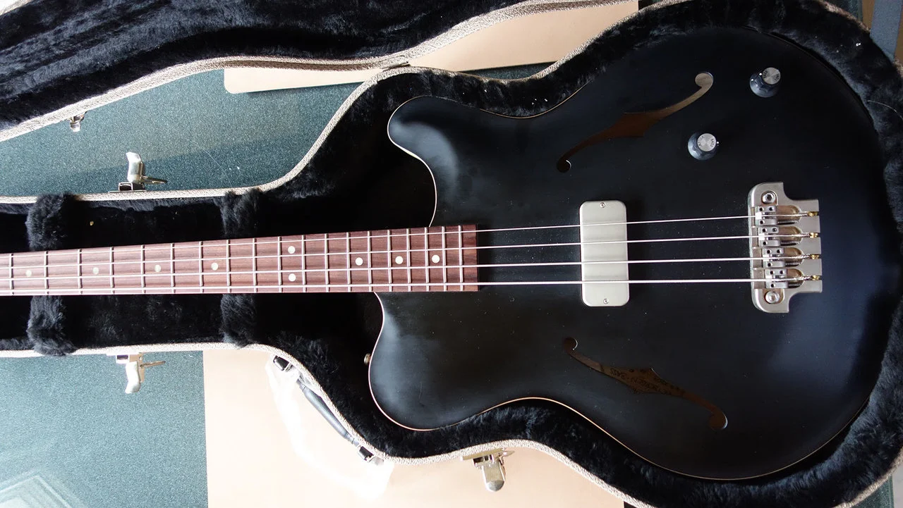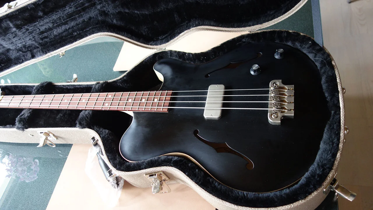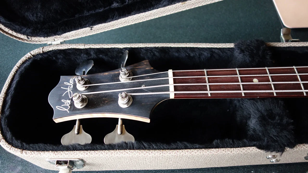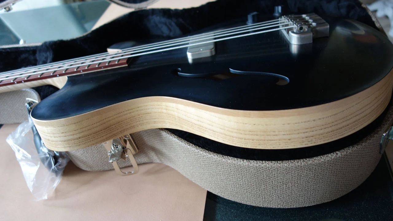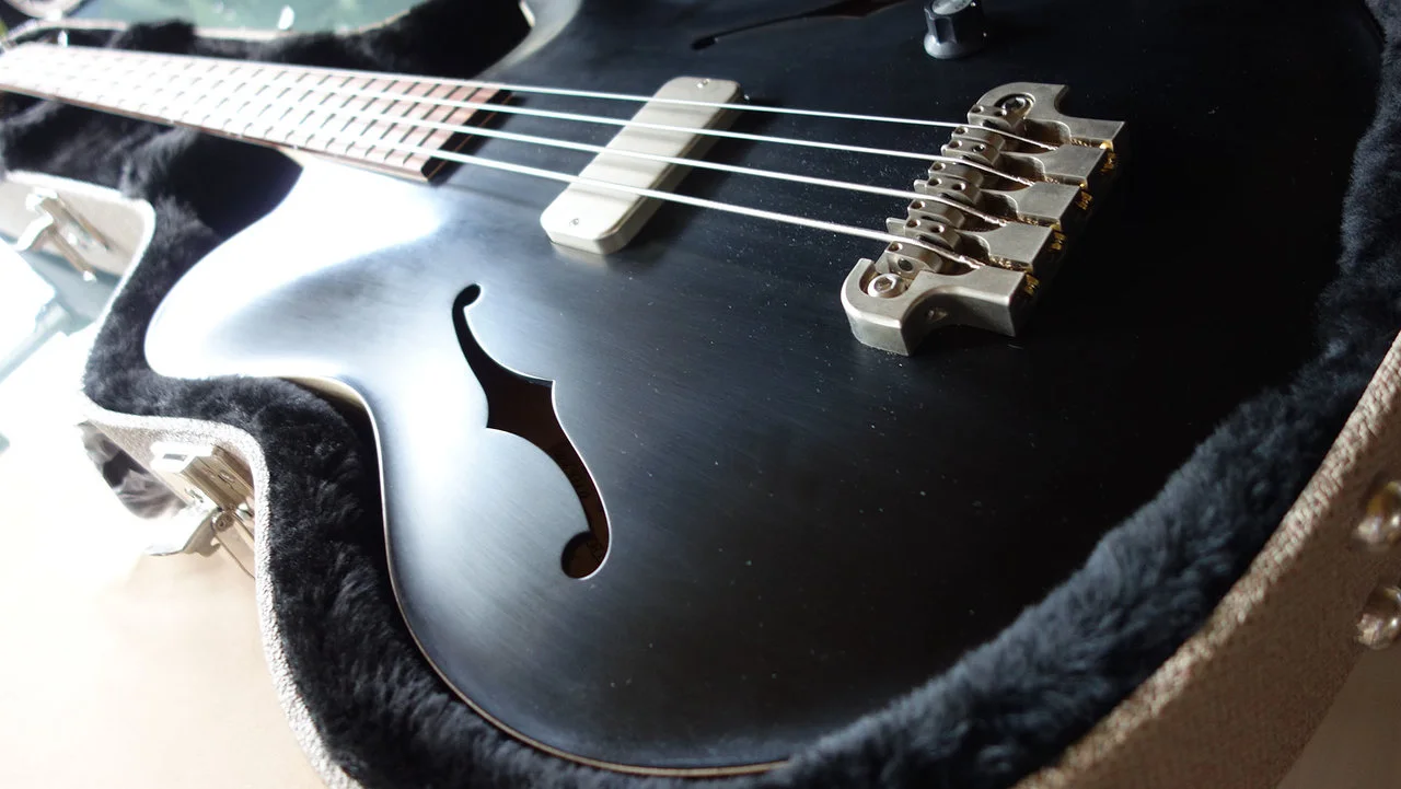 Ich habe den Bass 2020 von BTM Guitars in Nürnberg neu erworben. Leider komme ich mit der Geometrie des Korpus nicht zurecht, sie bereitet mir orthopädisch Schwierigkeiten. Der Bass (mit Elixier-Saiten) wurde vielleicht 20 h gespielt. Die weißen Punkte auf der schwarzen Oberfläche sind nur Staubflecken, der Bass ist makellos. Der Korpus wurde inkl. Seitenwände und Tonblock aus einem Stück Sumpfesche gefräst, ebenso die Decke, deren Wölbung aus dem Vollen gefräst ist.