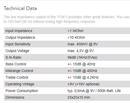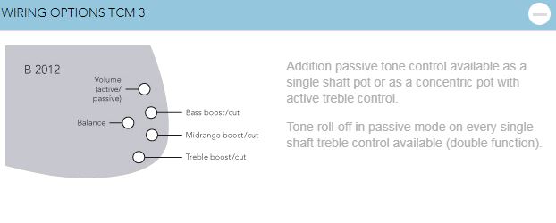 vol, bal, bass mid treble, inkl 1 treble blende im push pull modus,
