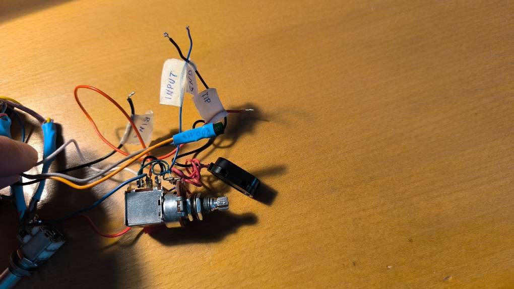 Sieht vielleicht wild verkabelt aus, ist aber ganz easy, die Anschlüsse sind alle markiert. Potiknöpfe (6mm Achsen, beim Stacked-Poti 6/8 mm) sind nicht dabei.