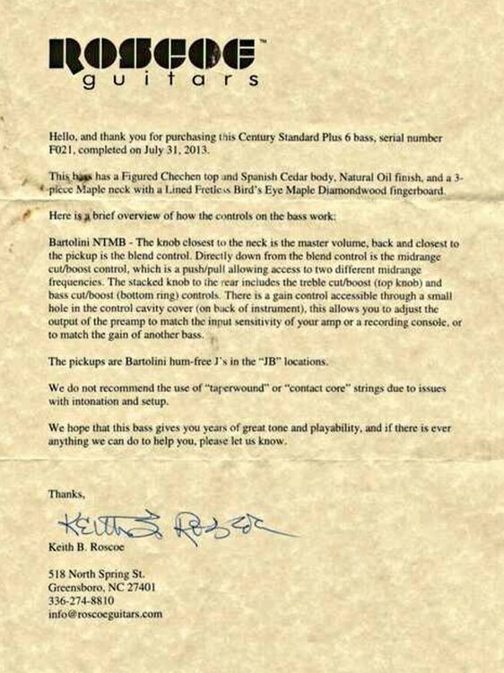 for sale this beautiful Roscoe Century Standard Plus fretless 6 string!