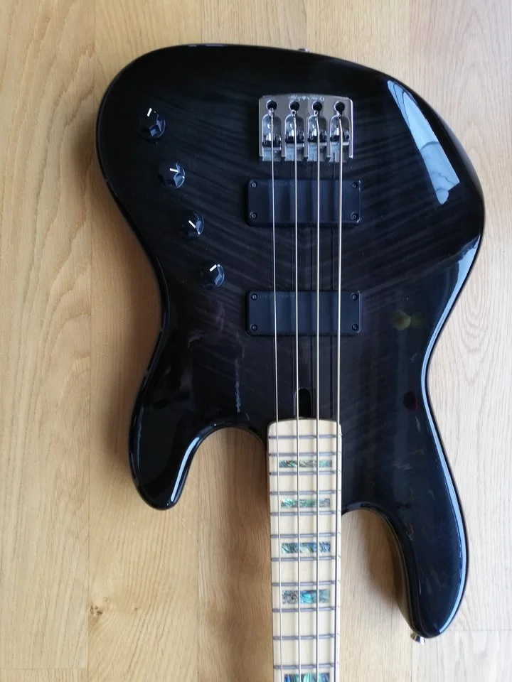 2x Overwater soapbar pickups. 2-band active EQ. Controls for vol (pull bright) / pan / treble / bass