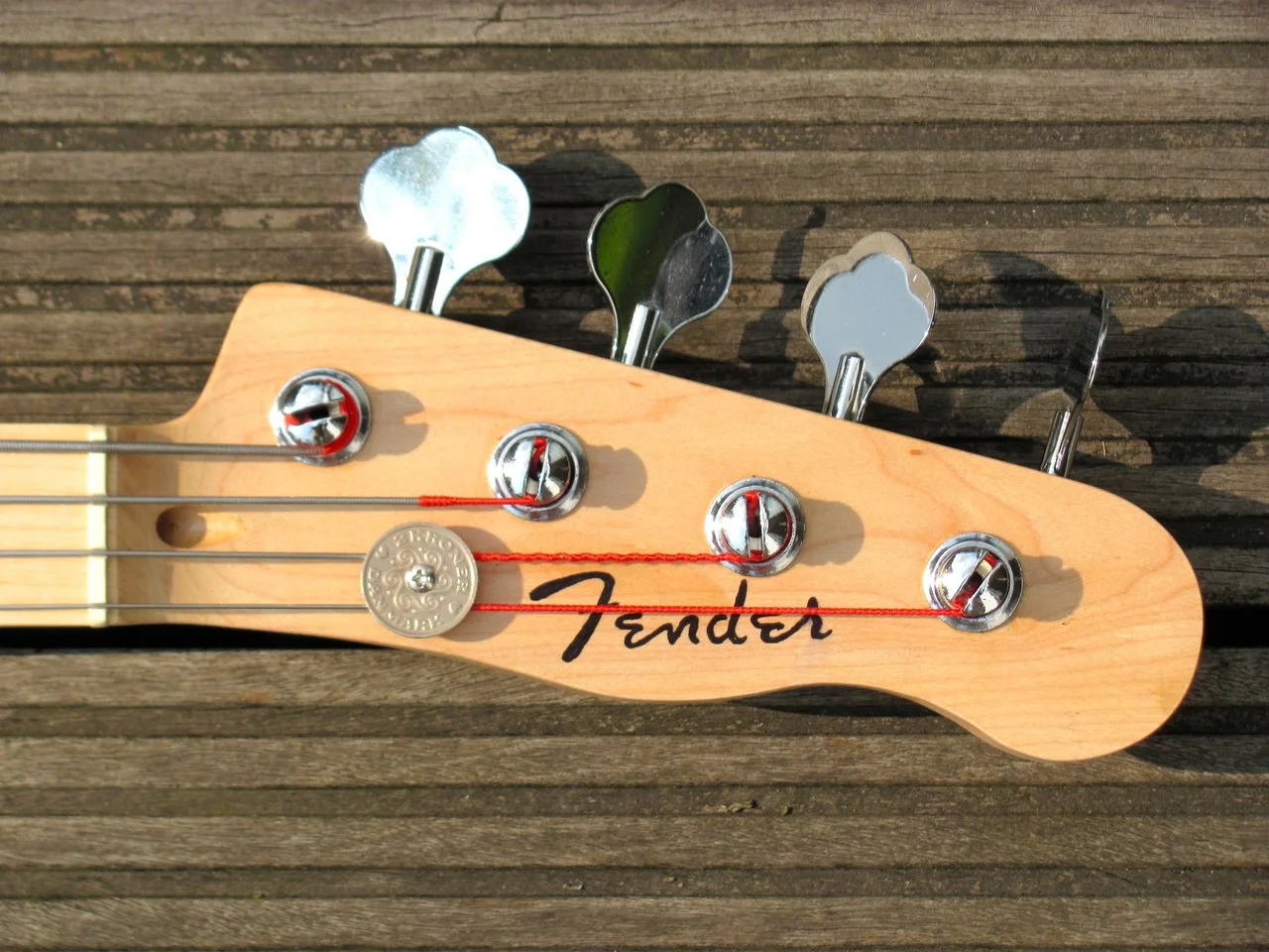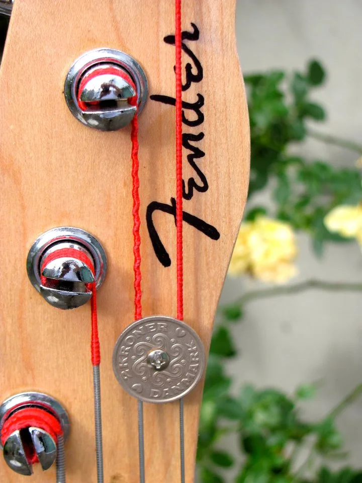 Trotz des fetten Halses hängt das 4-Kilo-Tier (Personenwaage) ausgewogen an der Schulter und spielt sich wie Butter. Da ich als Halter dieses recht rotzigen Viersaiters mittlerweile kurzhalsige Tierchen bevorzuge, ist der mit Edding signierte P-Bass nun in liebevolle Hände abzugeben: