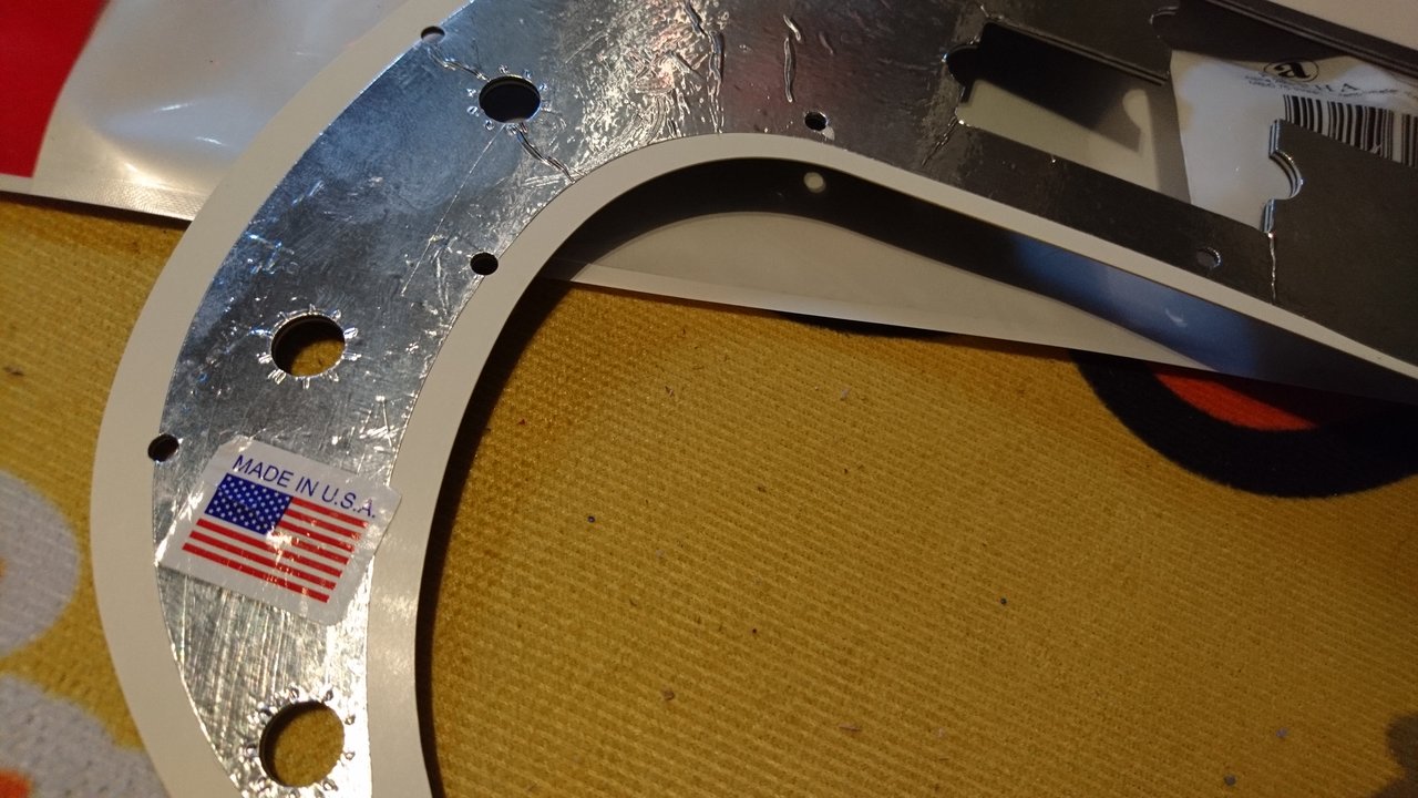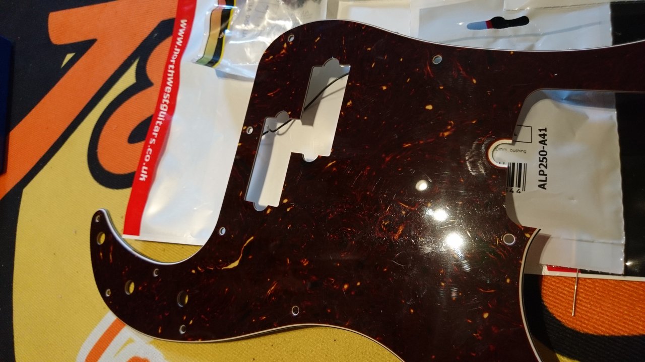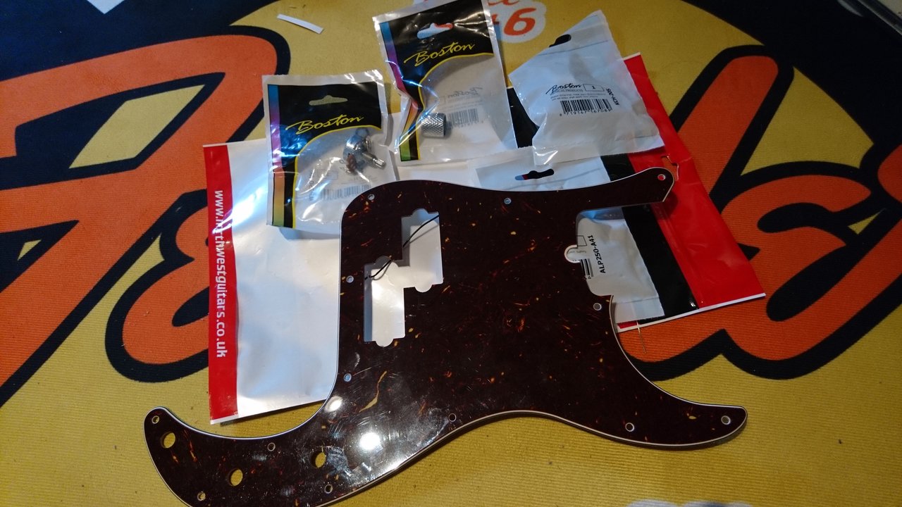 Leicht gebrauchtes Schlagbrett, dazu 2 Alpha Japan Potis, dazu 2 Boston Knobs, eine 47nf Kondensator und eine Buchse.