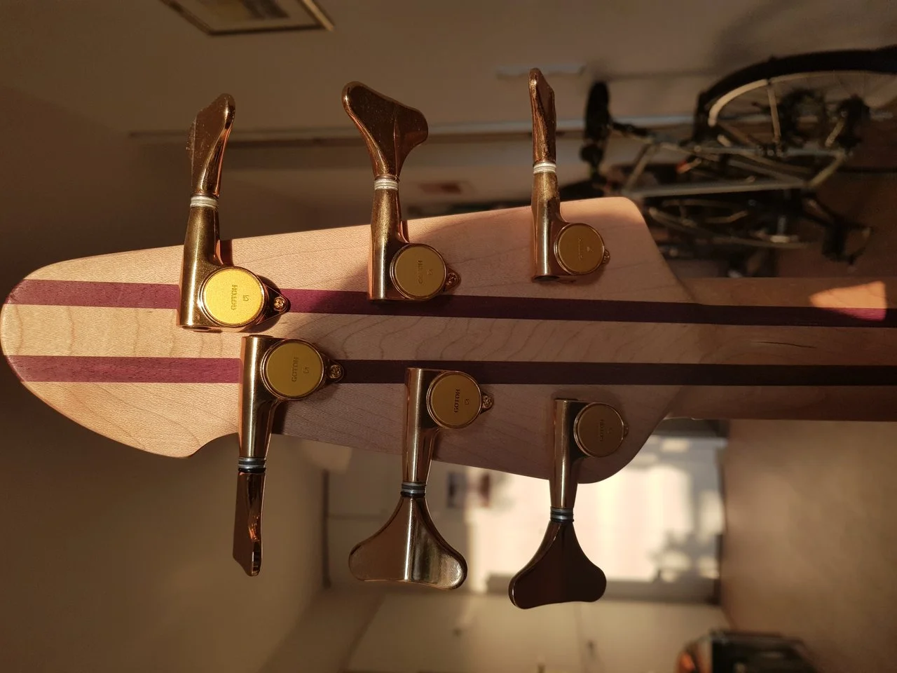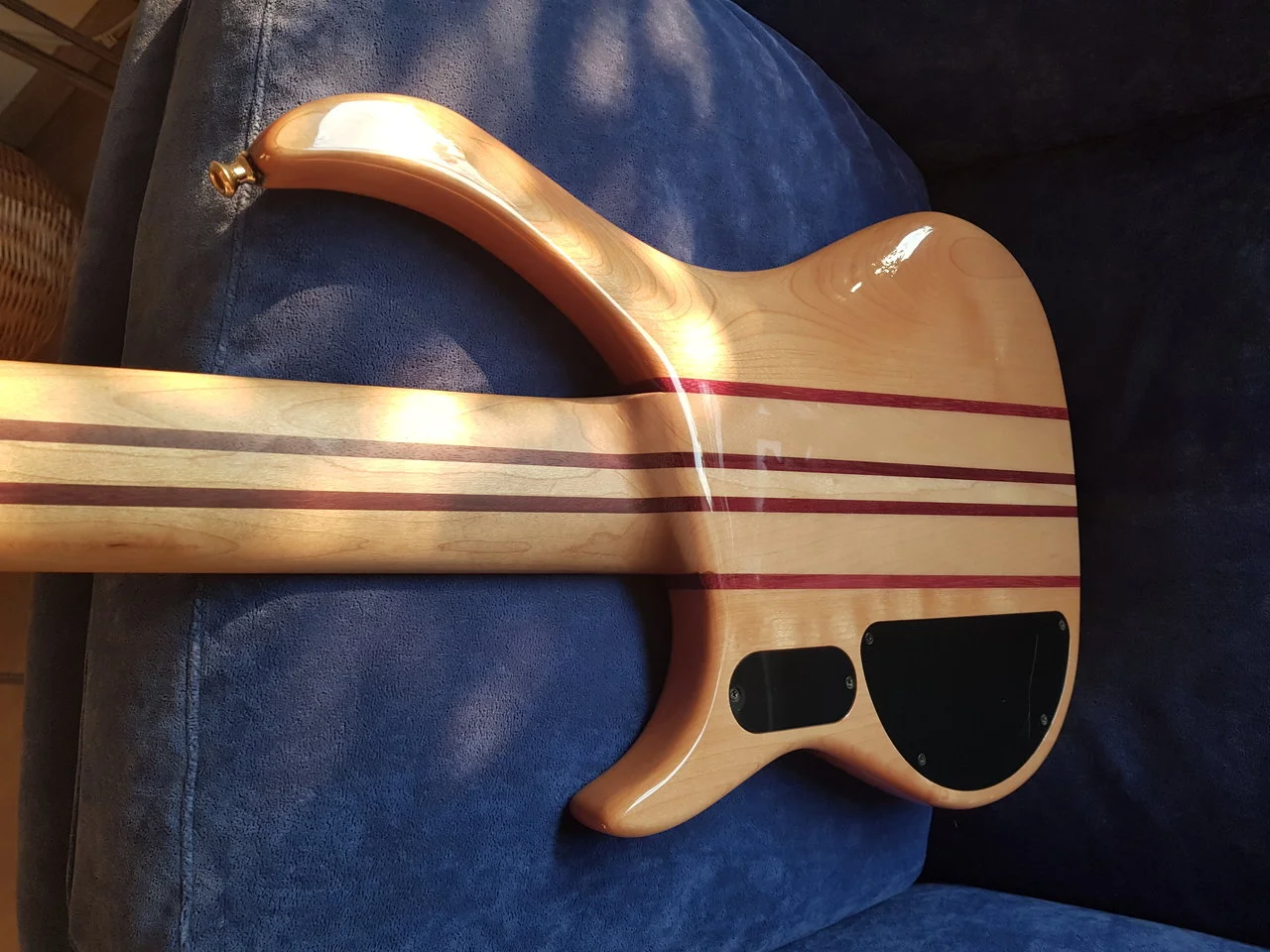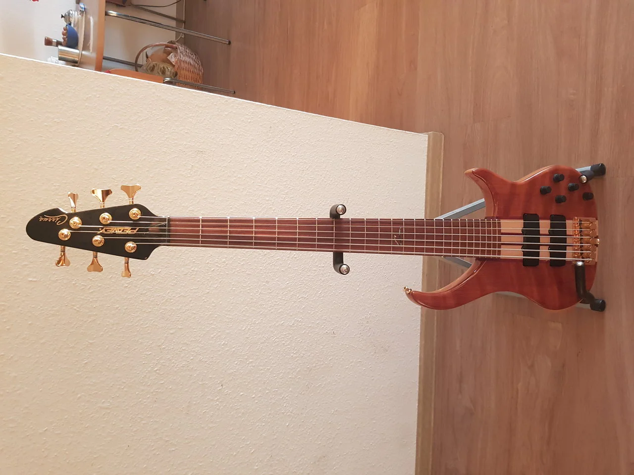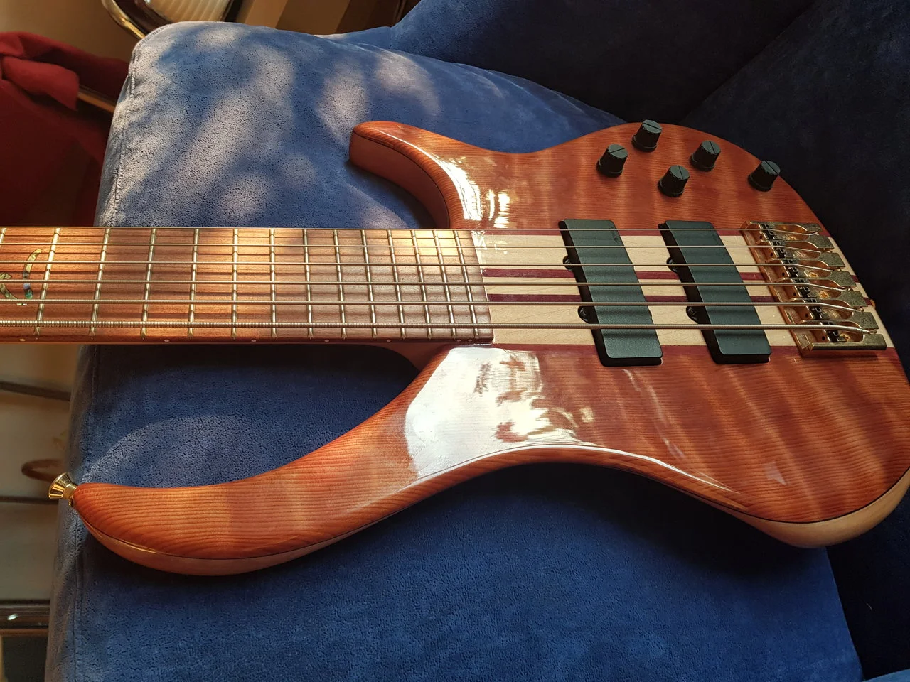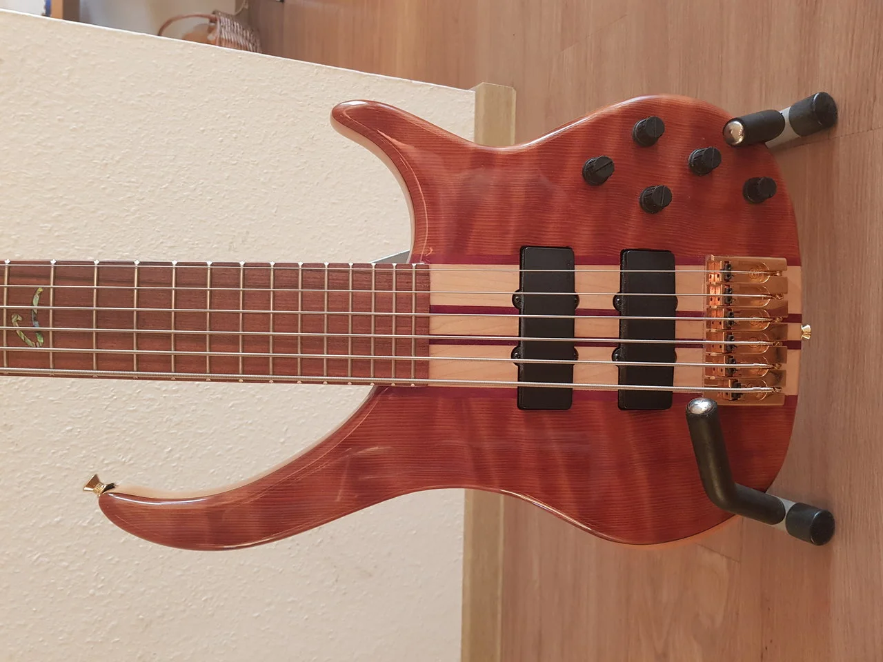 Der Bass ist ein in den USA gebautes 6-saitiges Modell mit einer Rotholzdecke, der Bass wurde mit verbesserten Gotoh-Stimmgeräten gut gepflegt, es gab einen kleinen Schrumpfriss, der vor 3 Jahren von einem Gitarrentechniker mit Epoxidharz gefüllt und geklemmt wurde und den Bass in keiner Weise beeinträchtigt. Der Rest des Basses ist wie in fast perfektem Zustand, keine Kratzer, Dellen oder Späne im Korpus etc.